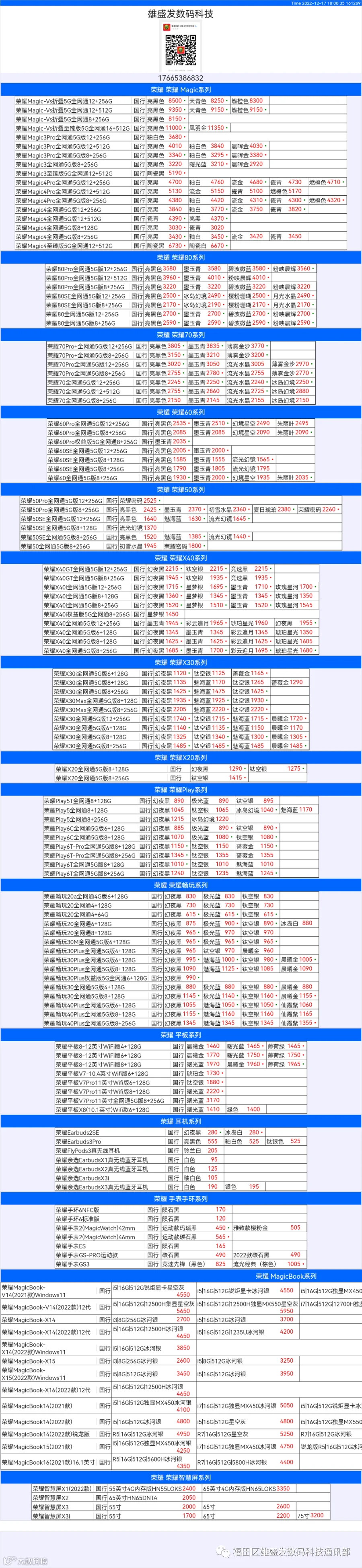 新机报价【2022年12月17日】华为 荣耀 报价