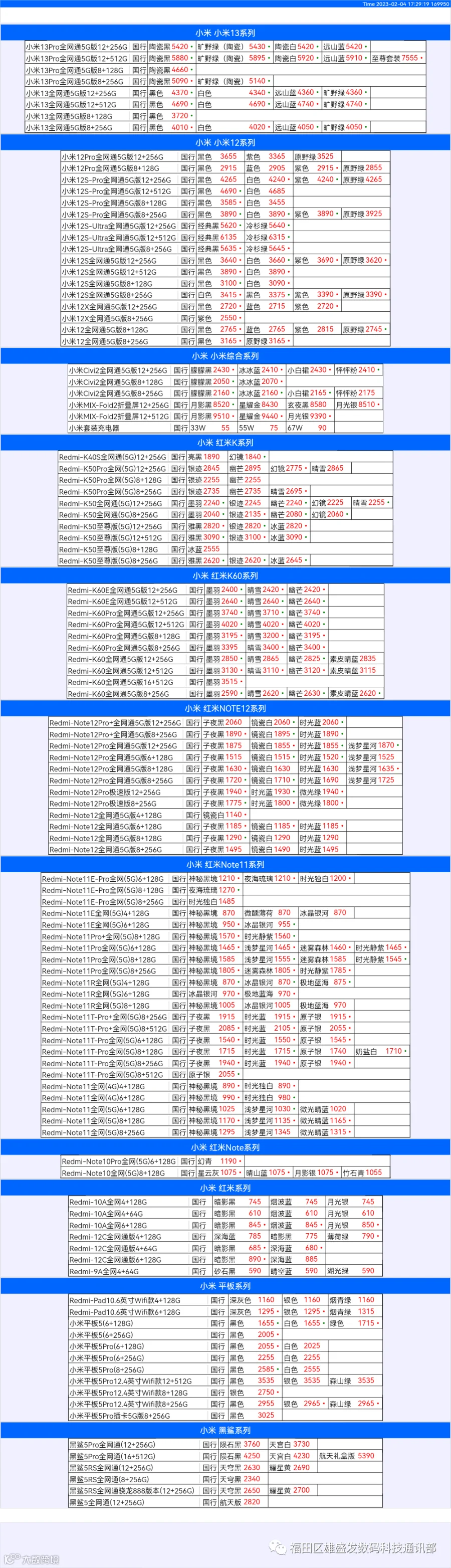 新机报价【2023年2月4日】小米  红米   黑鲨   报价 芯烨微 电子科技