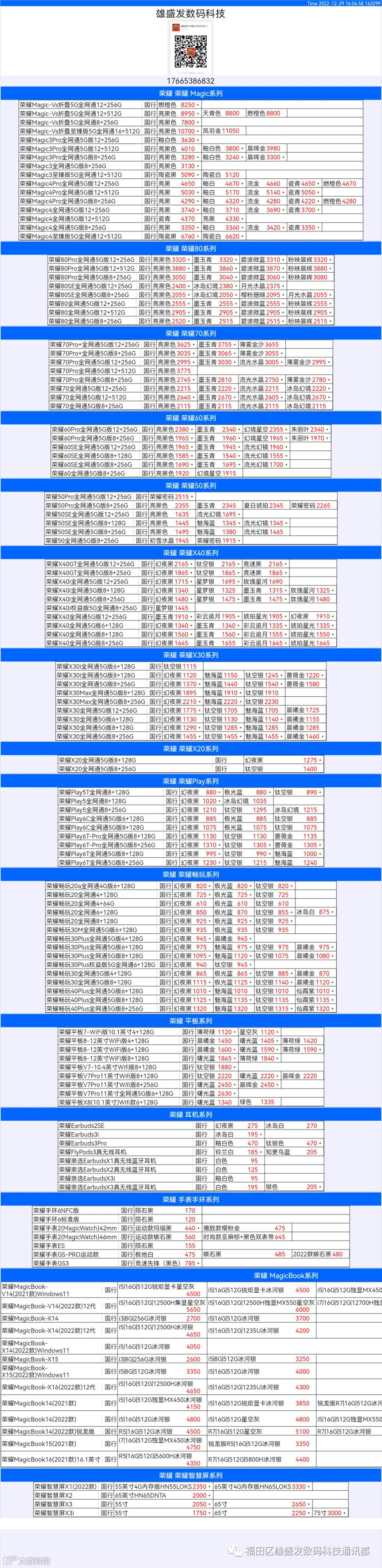 新机报价【2022年12月29日】华为   荣耀 报价 芯烨微 电子科技