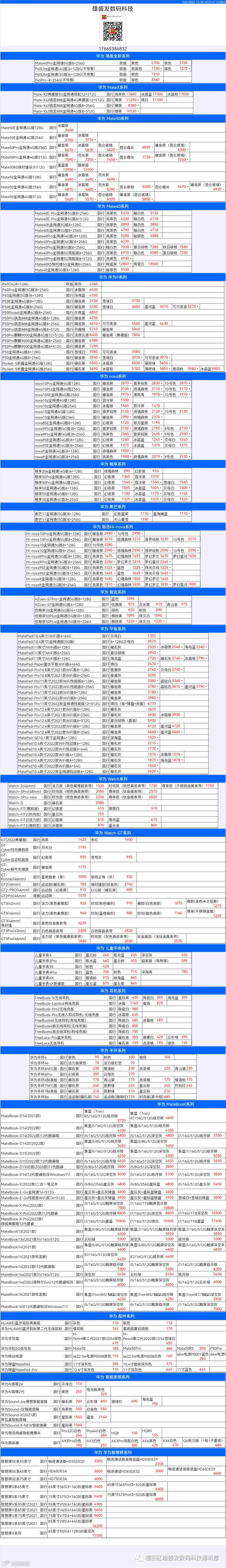 新机报价【2022年12月20日】华为   荣耀 报价 芯烨微 电子科技