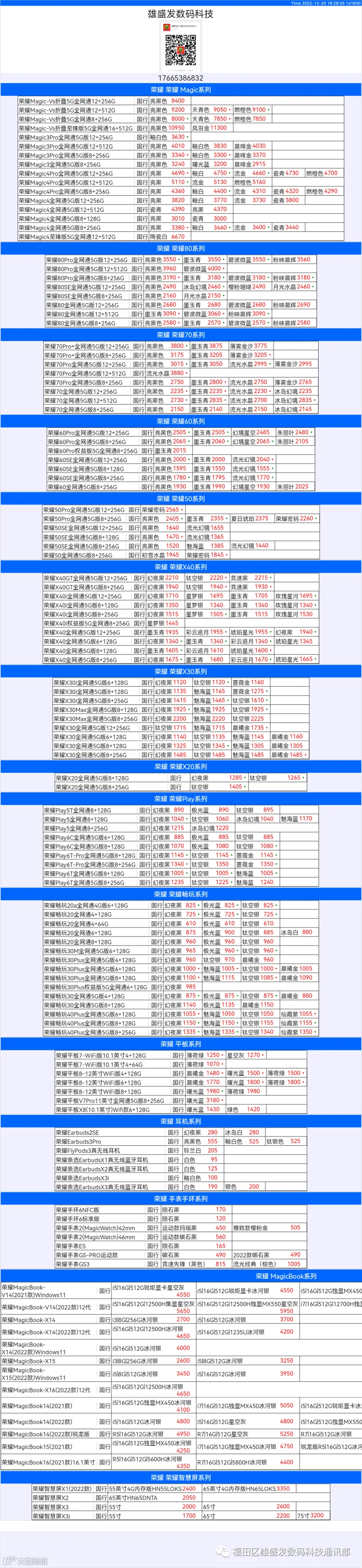 新机报价【2022年12月20日】华为 荣耀 报价