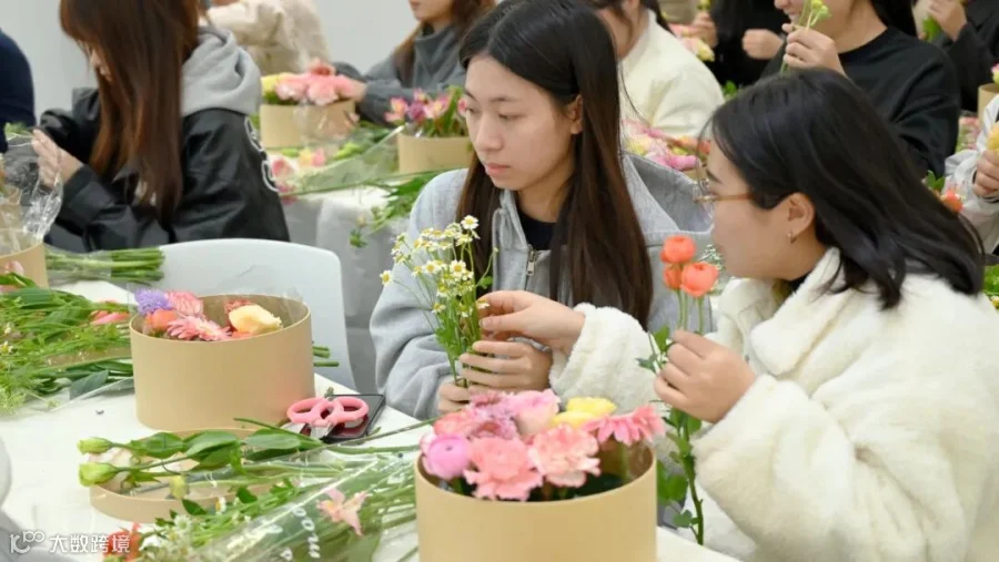 活动开始之前,花艺老师和工作人员便提前摆放每位参与者的专属花艺工具包,各式各样的花材、插花工具在桌面有序罗列,芯大厦瞬间化身春日花坊,处处弥漫着浪漫的气息。