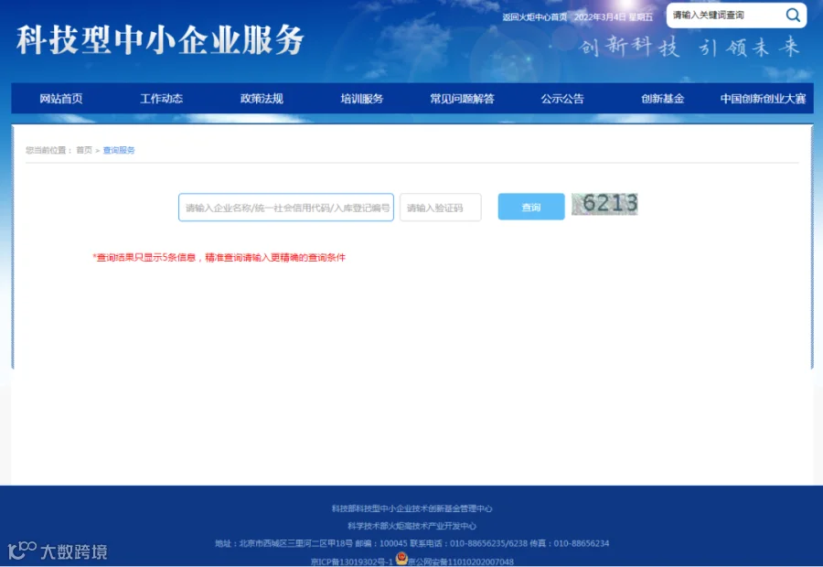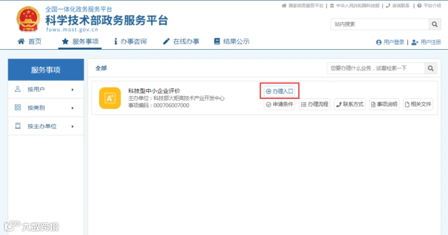 打开浏览器,搜索“科学技术部政务服务平台”,点击“热点服务”中的【科技型中小企业评价】。
