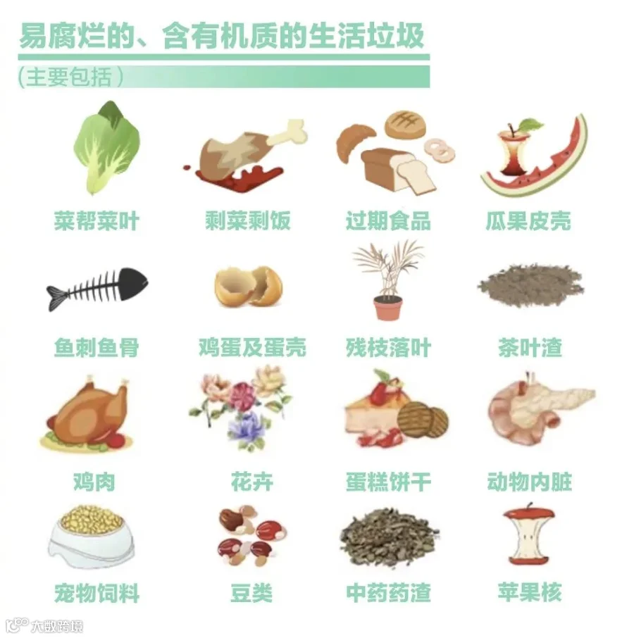 丢弃不用的菜叶、剩菜、剩饭、果皮、蛋壳、茶渣、骨头等。