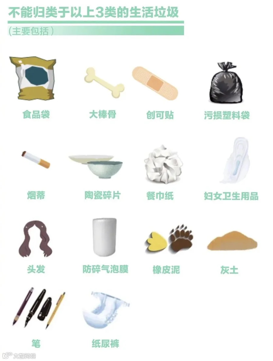 餐盒、餐巾纸、湿纸巾、卫生间用纸、塑料袋、食品包装袋、污染严重的纸、烟蒂、纸尿裤、一次性杯子、大骨头、贝壳、花盆等