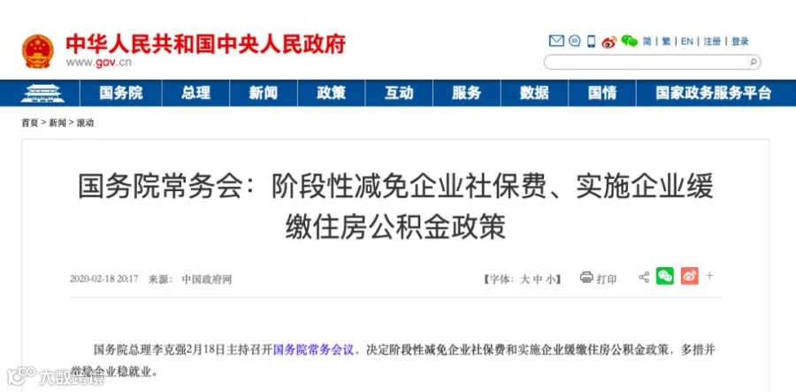 2月18日,国务院总理李克强主持召开国务院常务会议,决定阶段性减免企业社保费和实施企业缓缴住房公积金政策,多措并举稳企业稳就业。