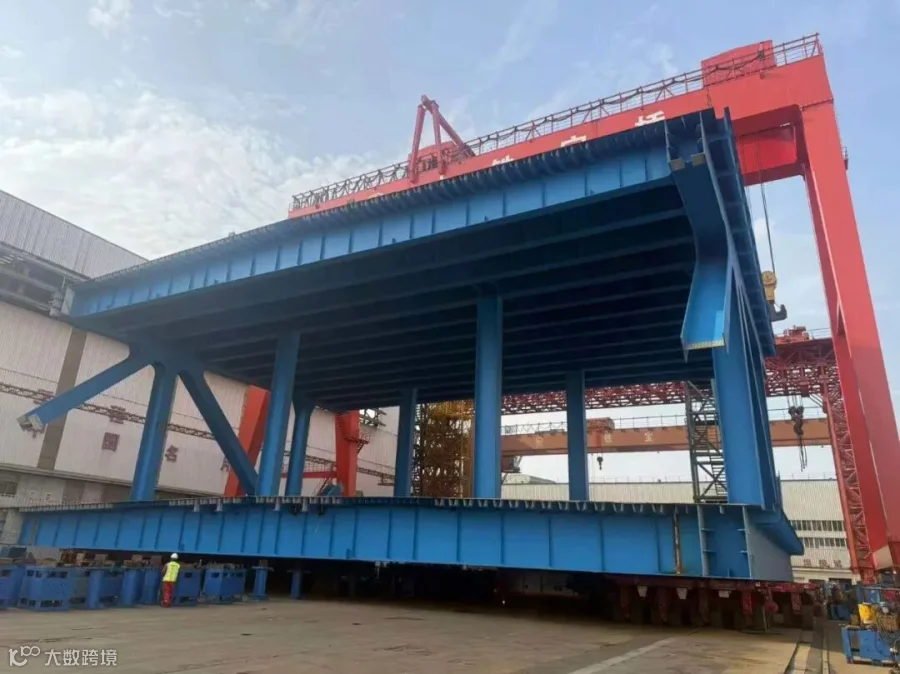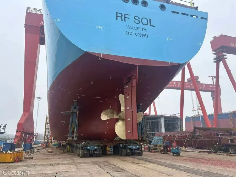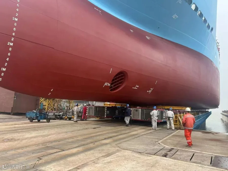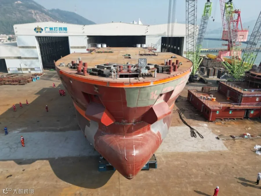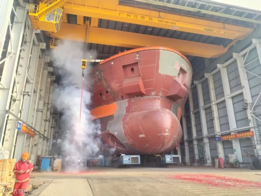 面对超万吨船舶移运的技术难点,广瀛团队凭借多年整船下水经验,精准把控船舶姿态,全程误差控制在毫米级,保障了船舶后续施工的顺利开展。