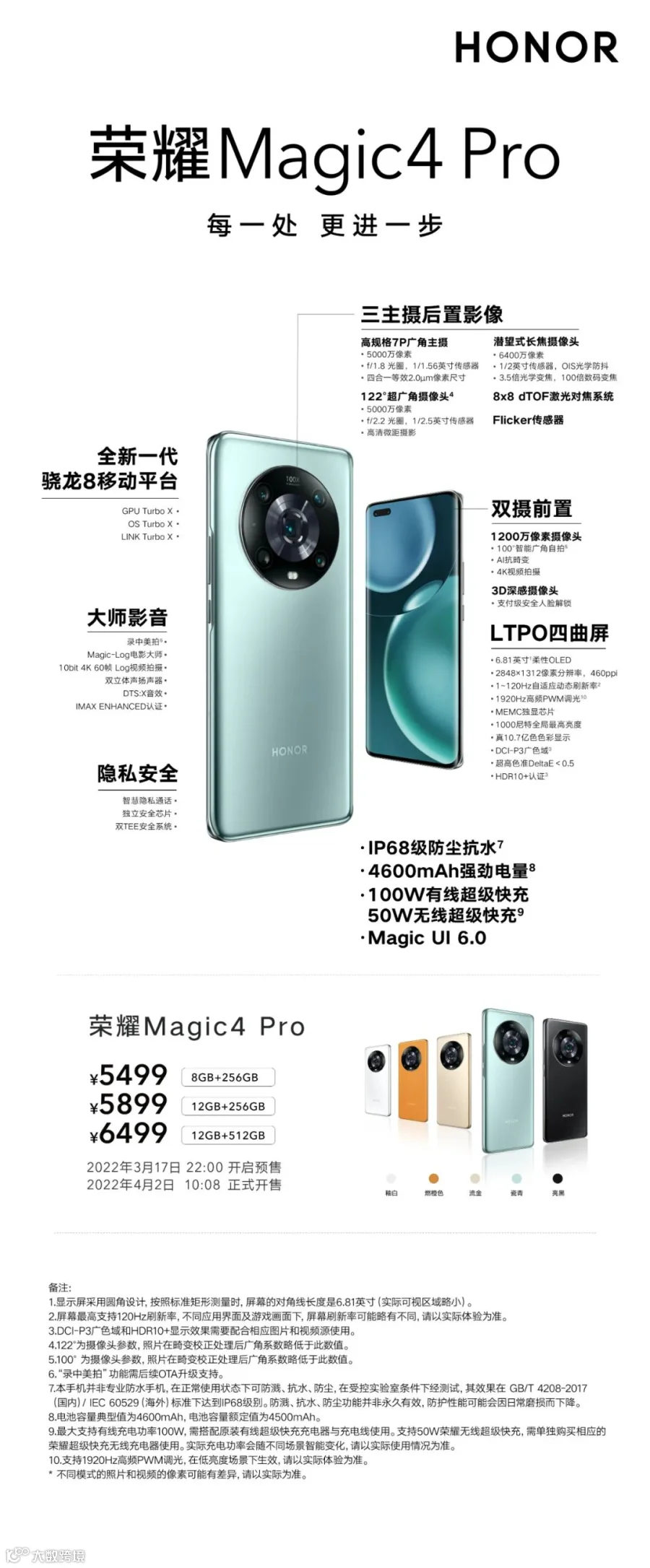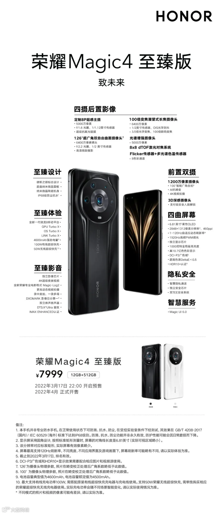 3月17日22 : 00,各授权门店开启预售!3月25日 10:08 荣耀Magic4正式开售 ,4月2日 10:08 荣耀Magic4 Pro正式开售,荣耀Magic4 至臻版将于4月开售,敬请期待!