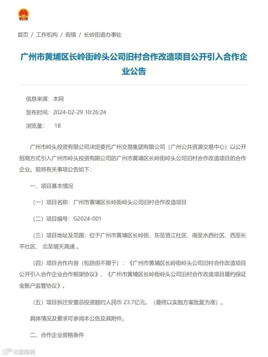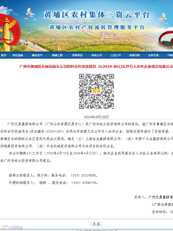 2月29日项目公开引入合作企业公告在广州公共资源交易中心、黄埔区人民政府门户网站及黄埔区农村集体“三资云”平台网站同步发布。