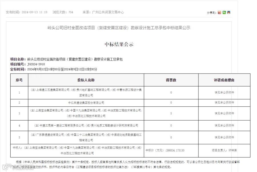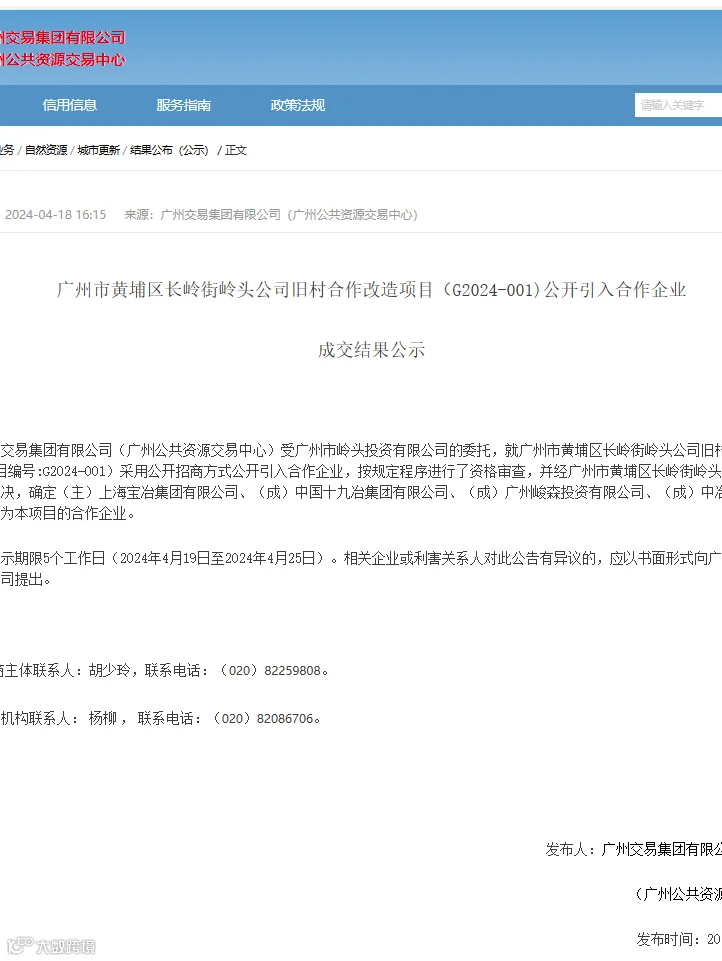 4月18日召开居民代表会议对候选合作企业进行表决,确定(主)上海宝冶集团有限公司、(成)中国十九冶集团有限公司、(成)广州峻森投资有限公司、(成)中冶长城投资有限公司为项目竞得合作企业。