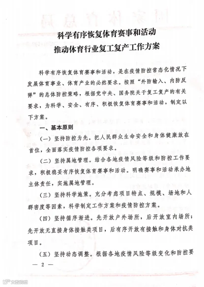导读:国家体育总局正式印发《科学有序恢复体育赛事和活动推动体育行业复工复产工作方案》