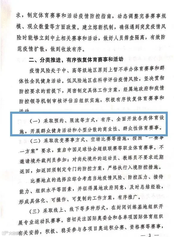 推动体育行业复工复产工作方案》,要求分类推进、有序恢复体育赛事和活动。