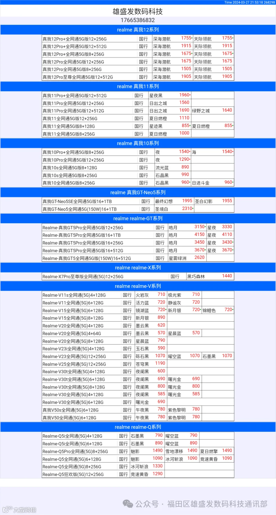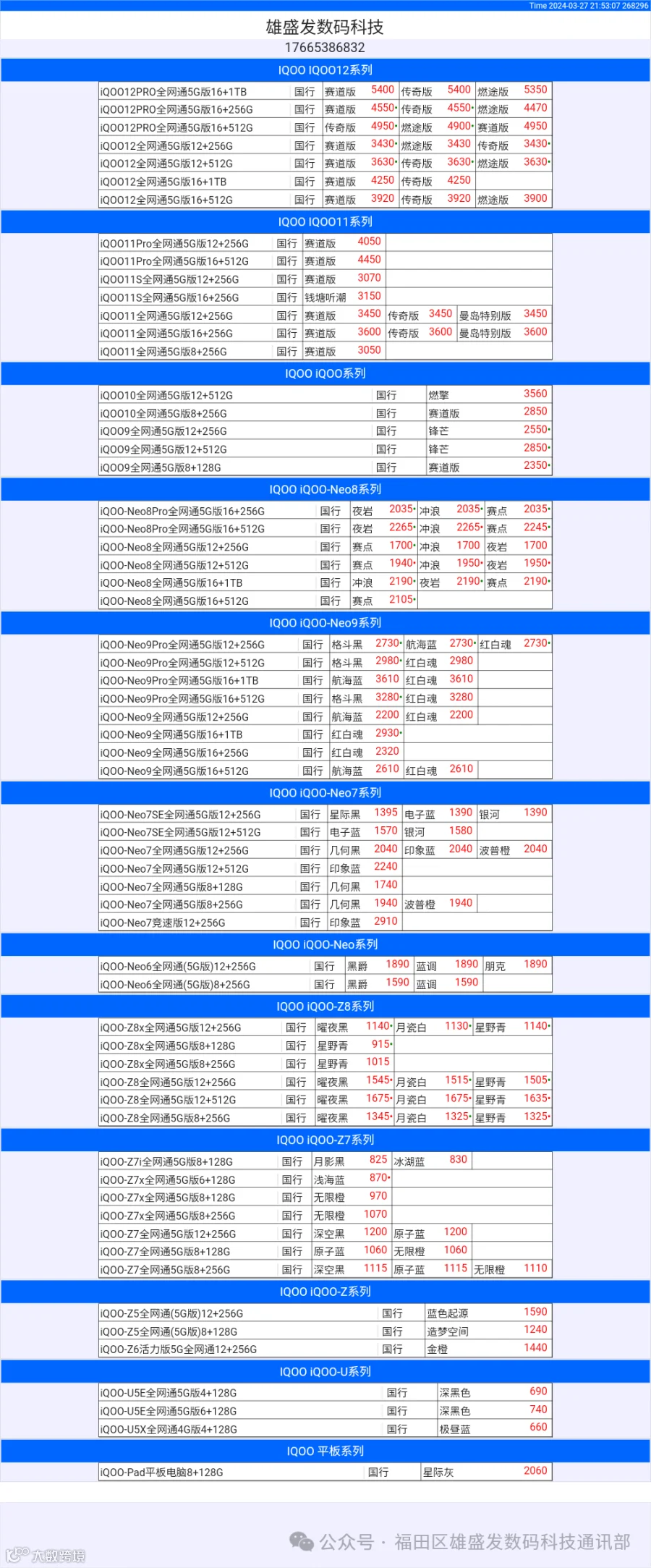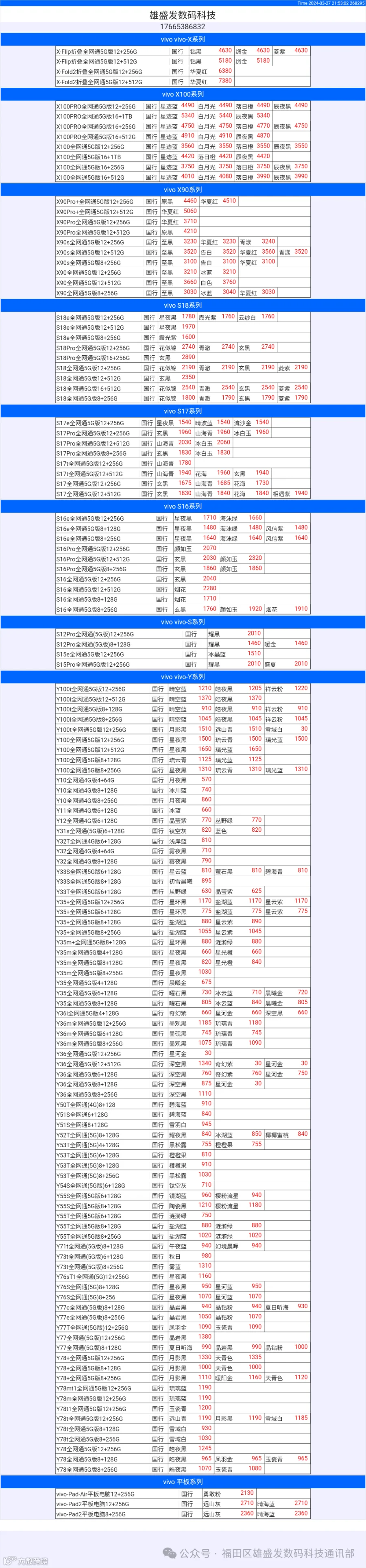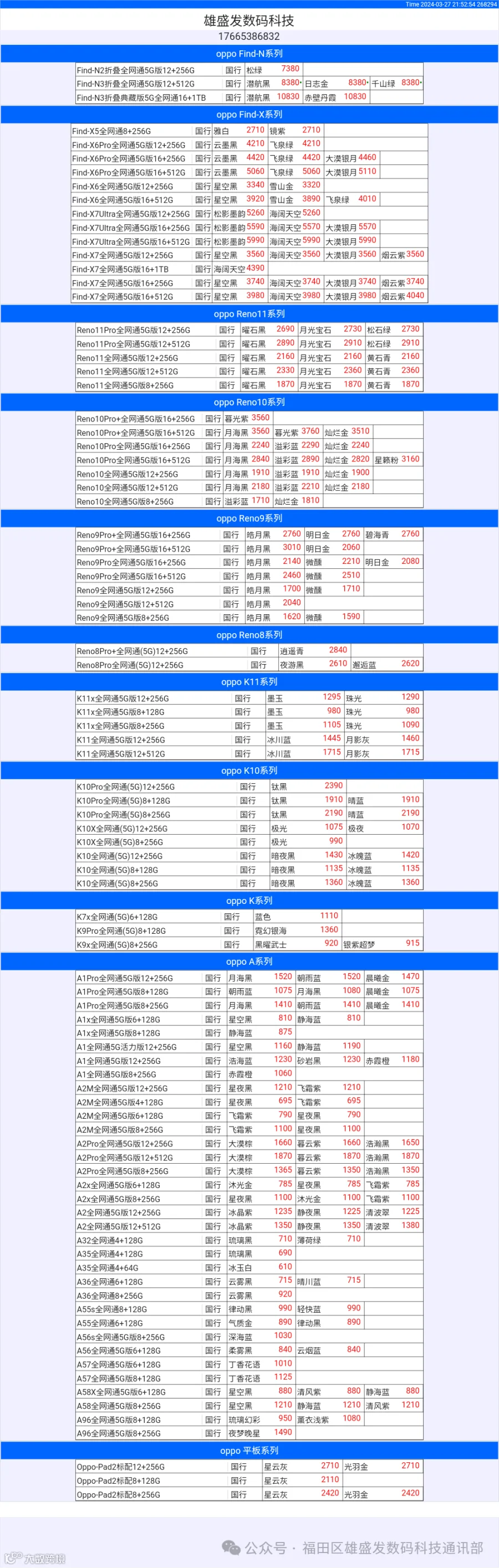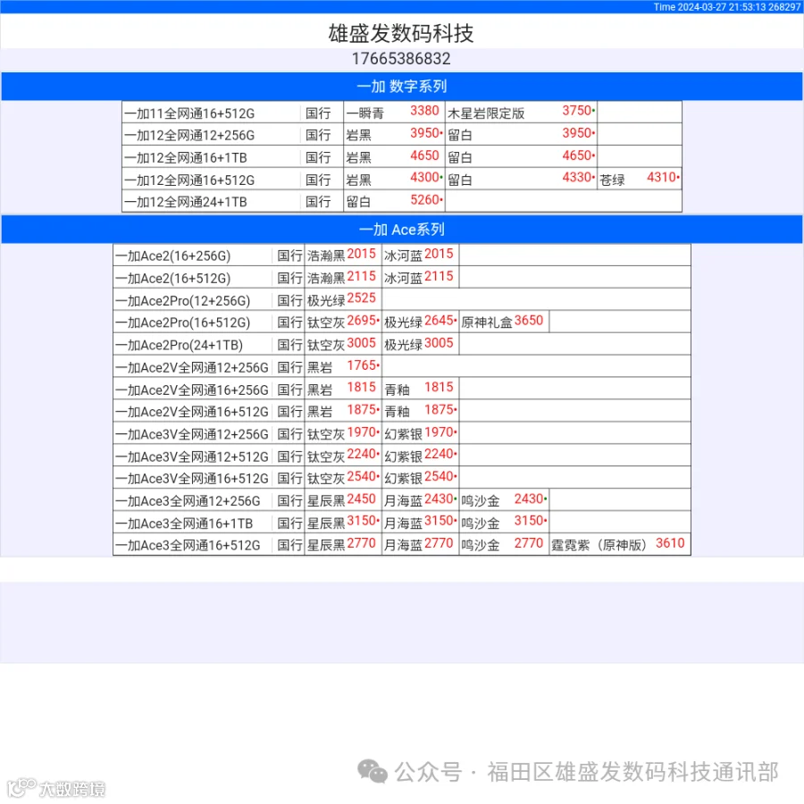 新机报价【2024年3月27日】OPPO   VIVO  IQOO   一加   真我 芯烨微 电子科技