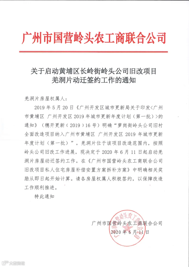 2019年5月20日《广州开发区城市更新局关于印发<广州市黄埔区 广州开发区2019年城市更新年度计划(第一批)>的通知》(穗开更新﹝2019﹞16号)明确“萝岗街岭头公司旧村全面改造项目纳入广州市黄埔区 广州开发区2019年城市更新年度计划(第一批)”。羌洞片位于该项目改造范围内。按照岭头公司旧改工作进展,现决定于2020年6月11日起启动羌洞片房屋动迁签约工作。在《广州市国营岭头农工商联合公司旧改项目私人住宅房屋补偿安置方案拆补方案》中明确相关奖励从即日起开始计算。请各房屋权属人积极签约,以保障改造工作顺利推进。