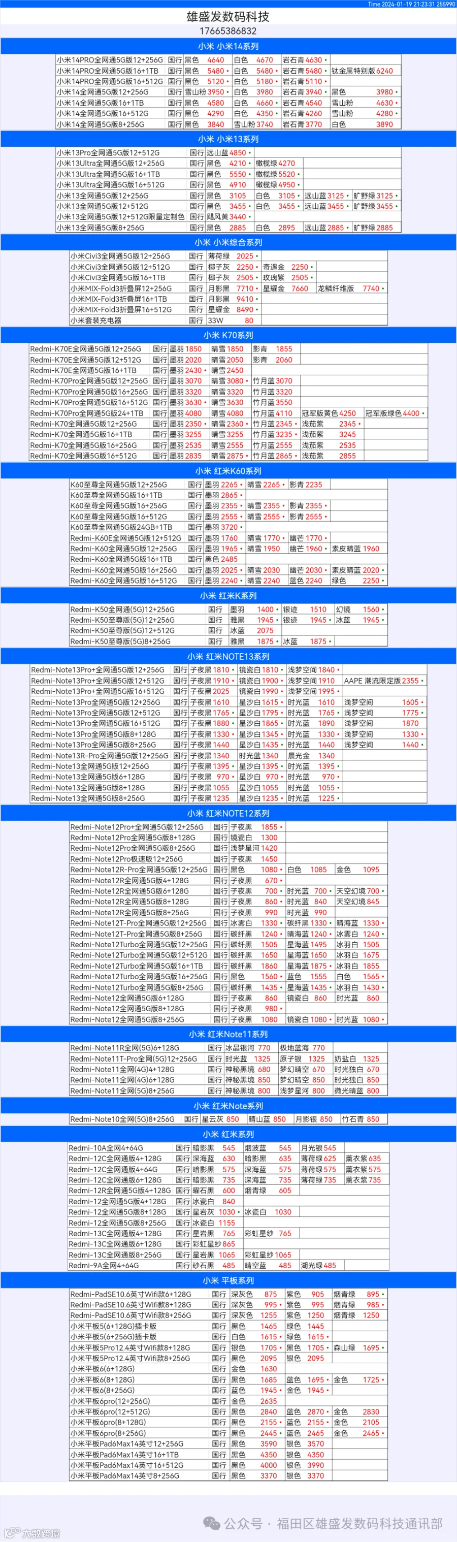 新机报价【2024年1月19日】小米  红米   黑鲨   报价 芯烨微 电子科技