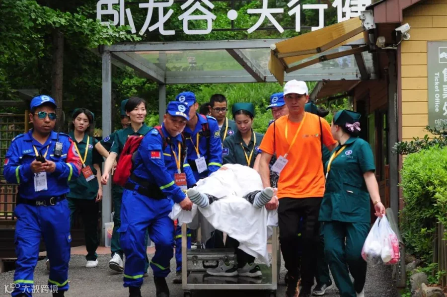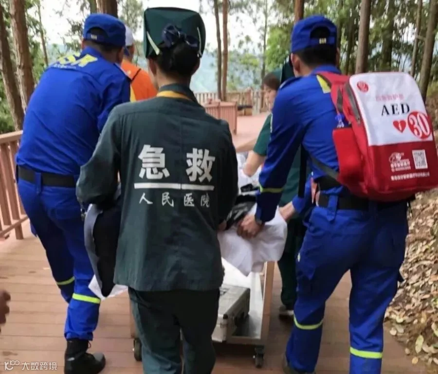 (在栈道上运输受伤跑友)