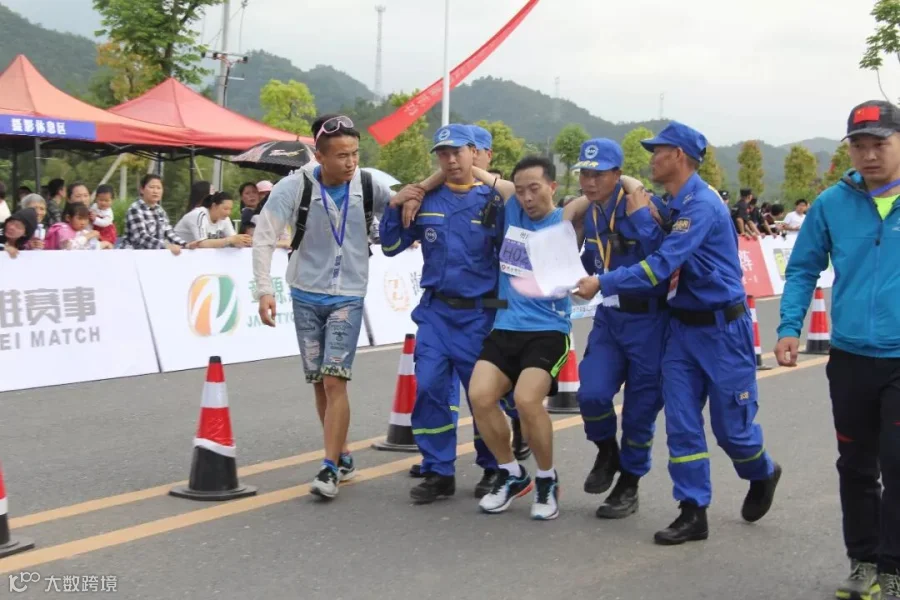 于是我们在比赛期间看到了每100米有一名蓝天救援队成员,每2.5公里就有一处医疗站,还有很多暖心瞬间,跪着为跑友喷药,背着跑友陪他冲过他追梦的终点,扛着担架走过4.5公里的木塑栈道等等。