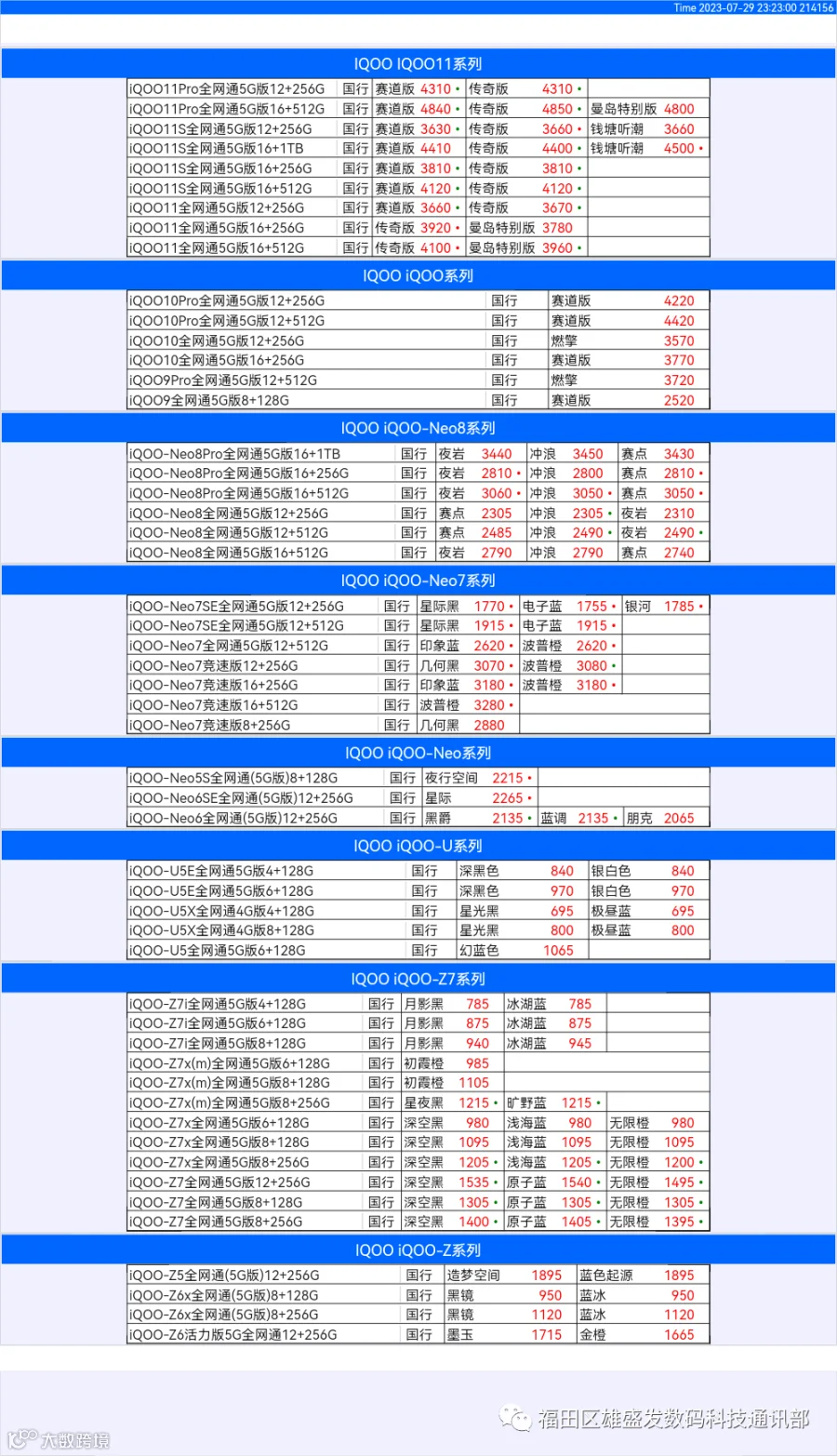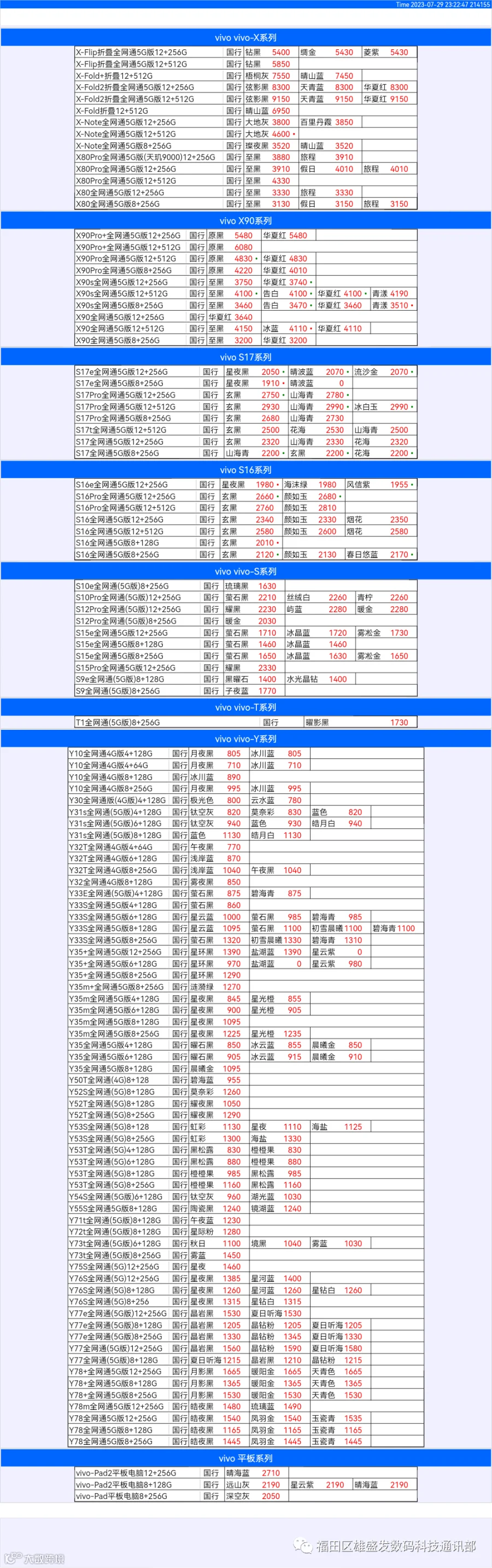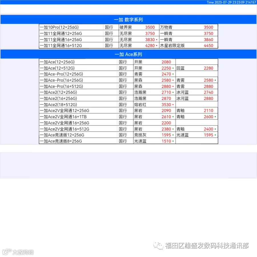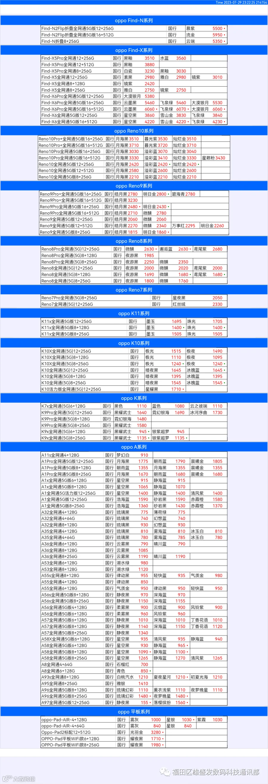 新机报价【2023年7月29日】OPPO   VIVO  IQOO   一加   真我 芯烨微 电子科技