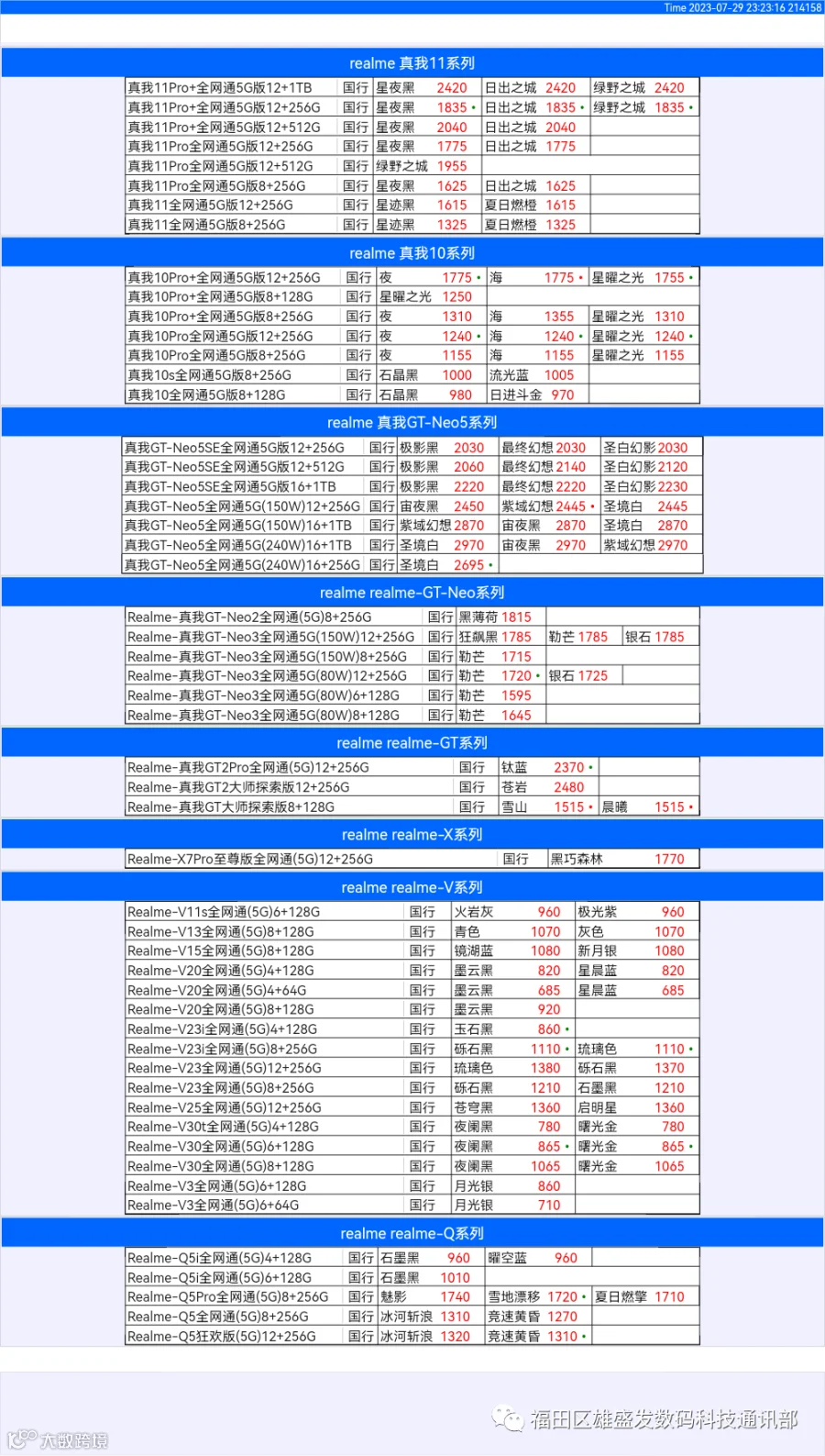 新机报价【2023年7月29日】OPPO VIVO IQOO 一加 真我