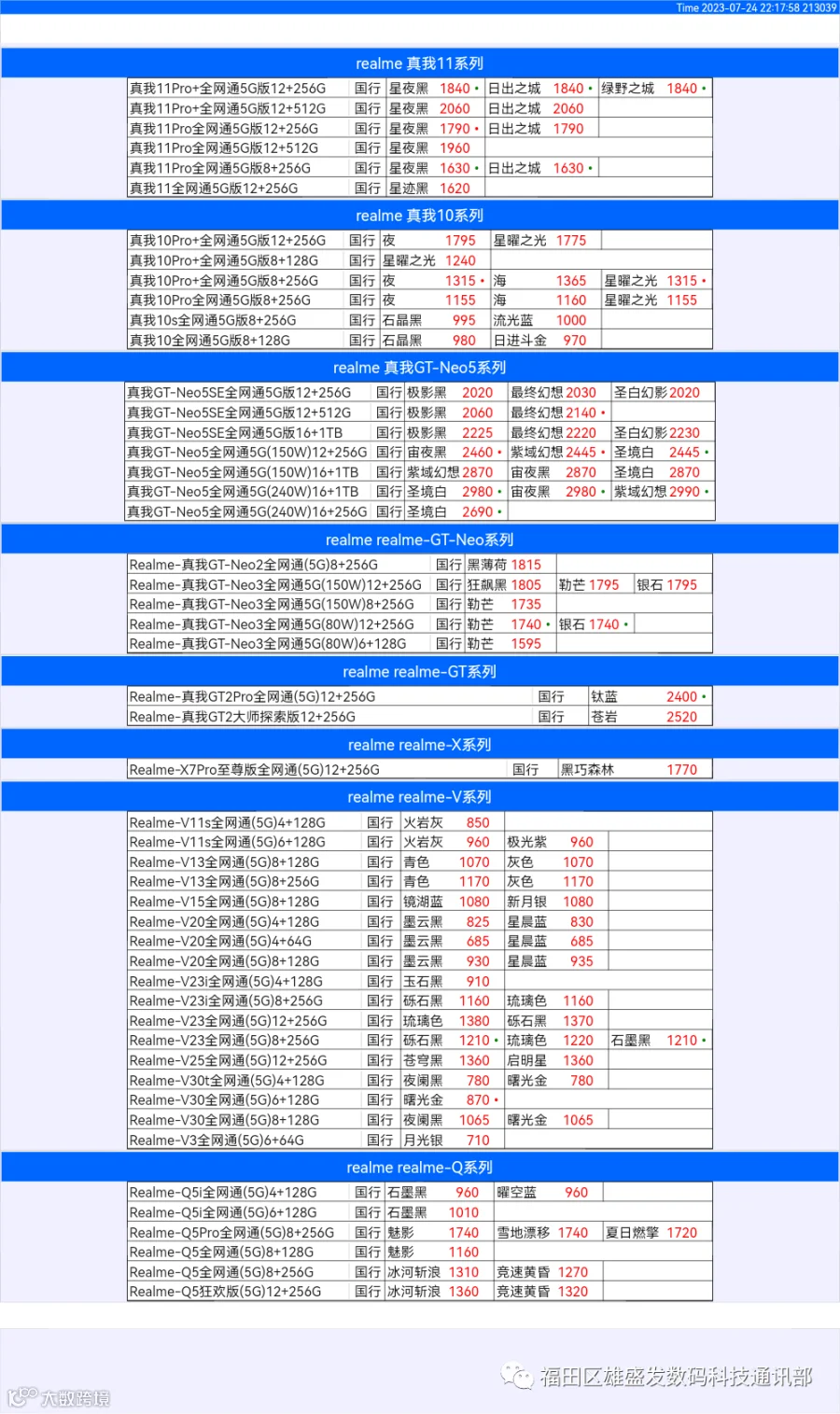 新机报价【2023年7月24日】OPPO VIVO IQOO 一加 真我