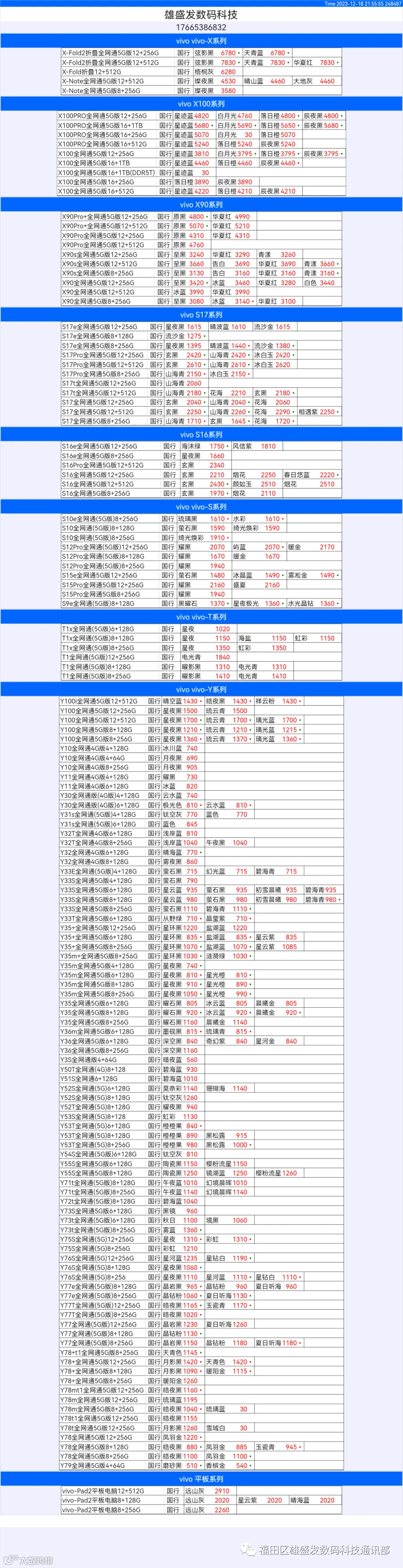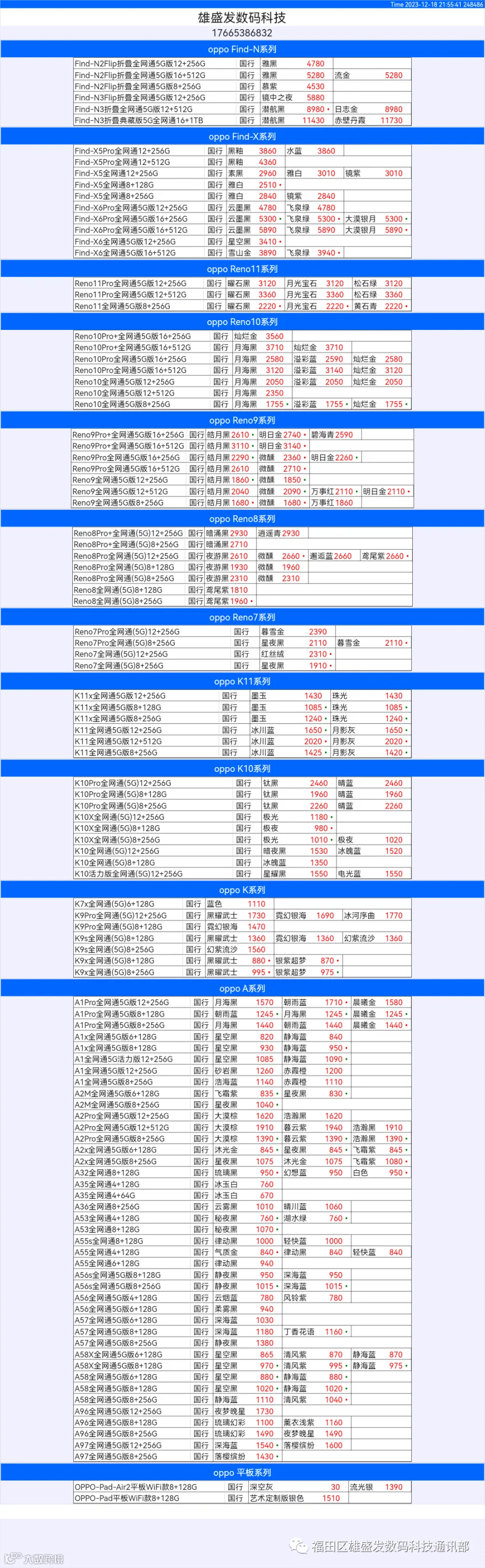 新机报价【2023年12月18日】OPPO   VIVO  IQOO   一加   真我 芯烨微 电子科技