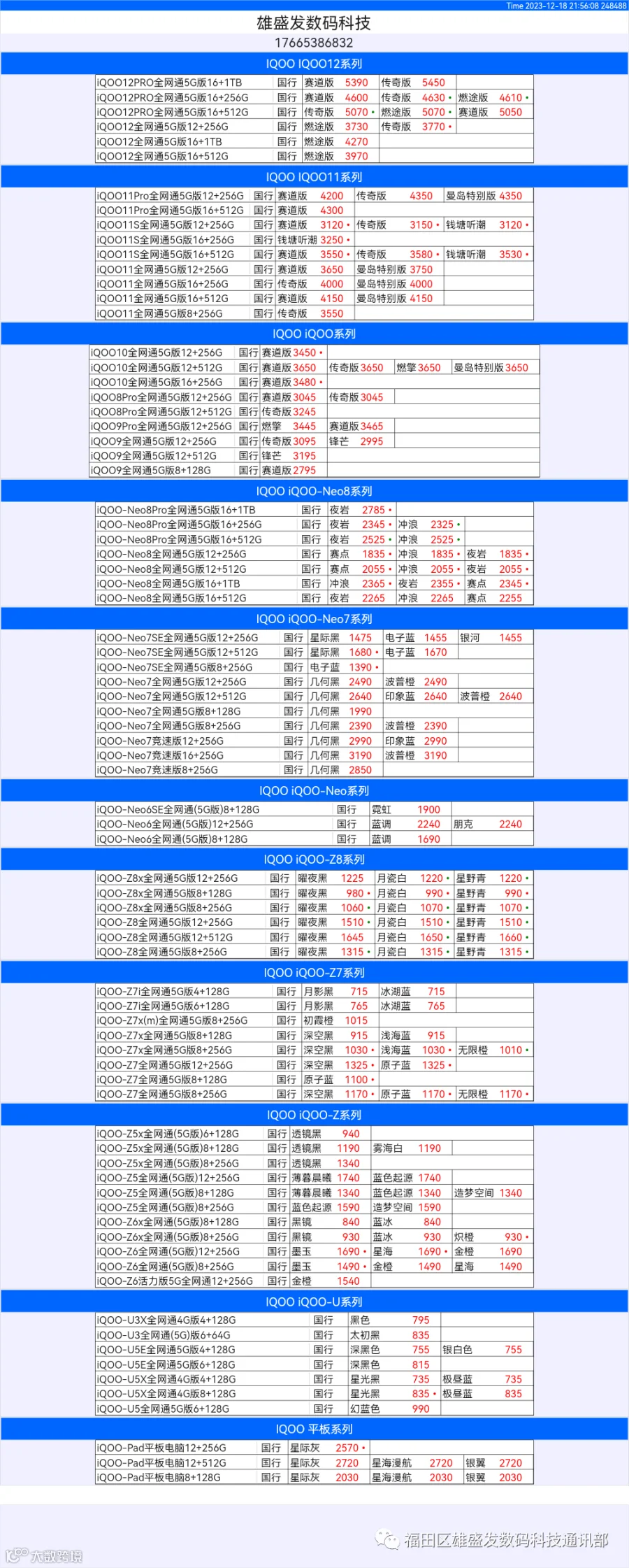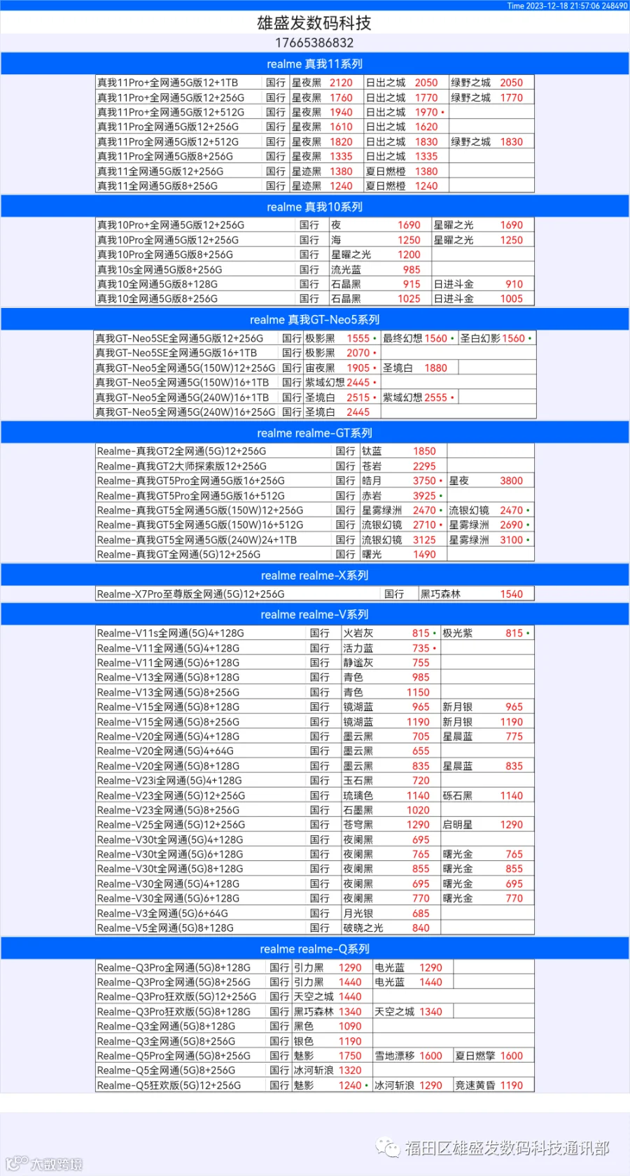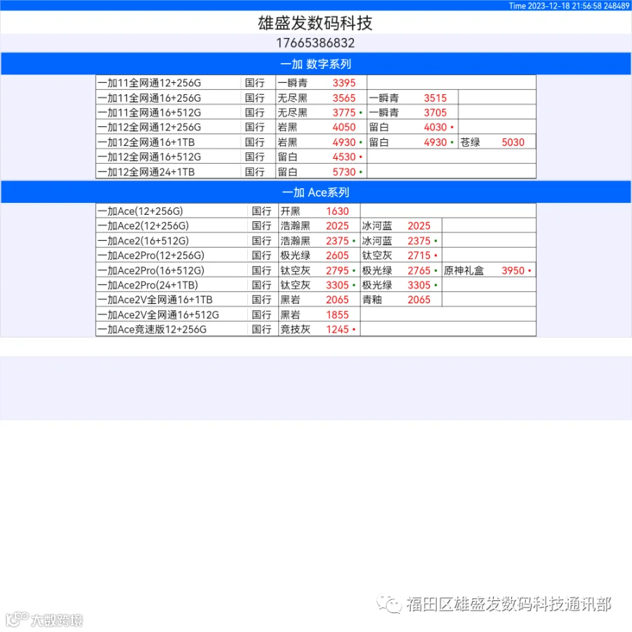 新机报价【2023年12月18日】OPPO VIVO IQOO 一加 真我