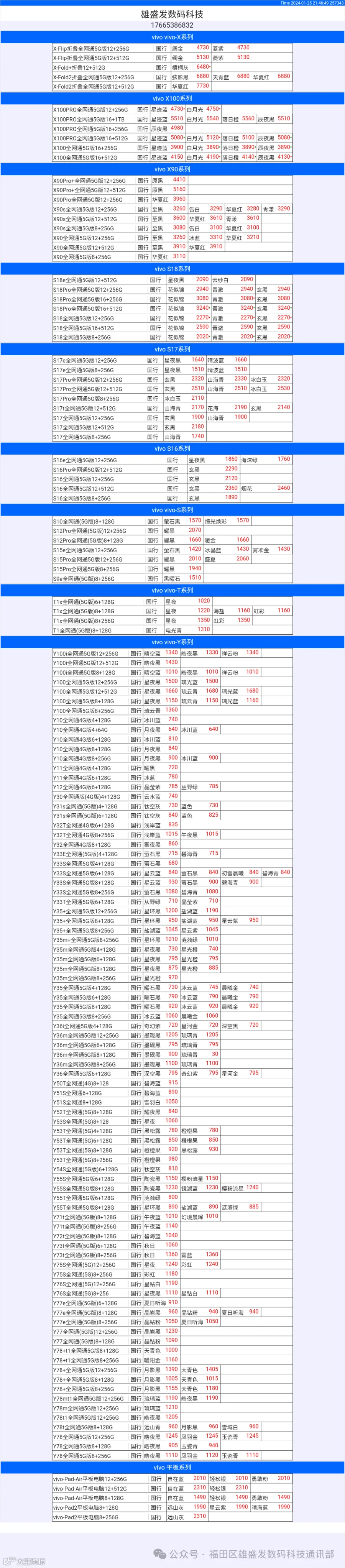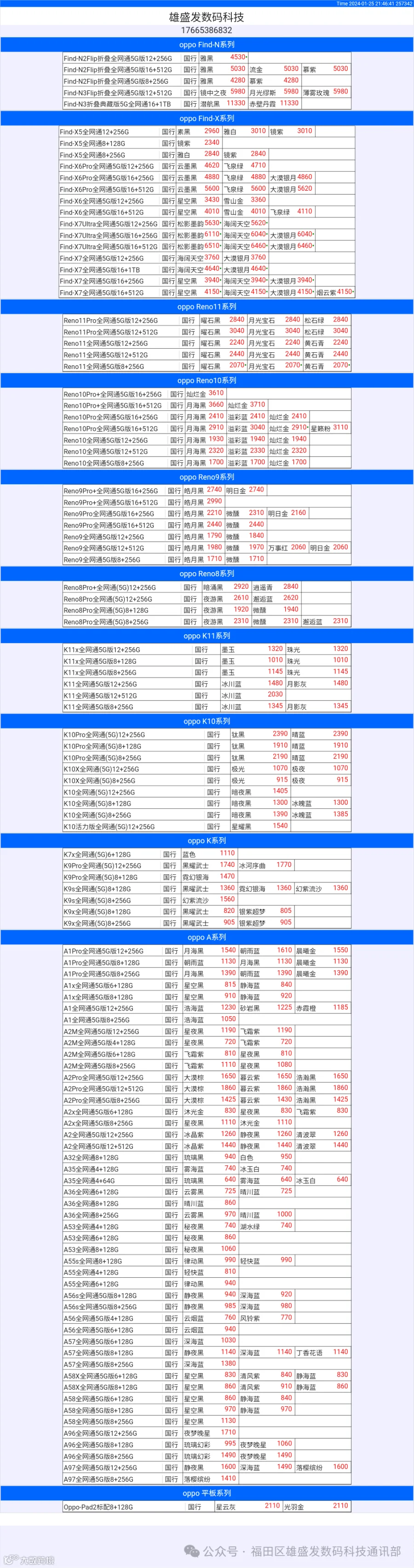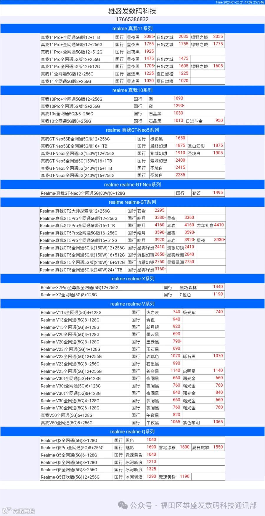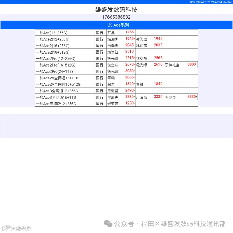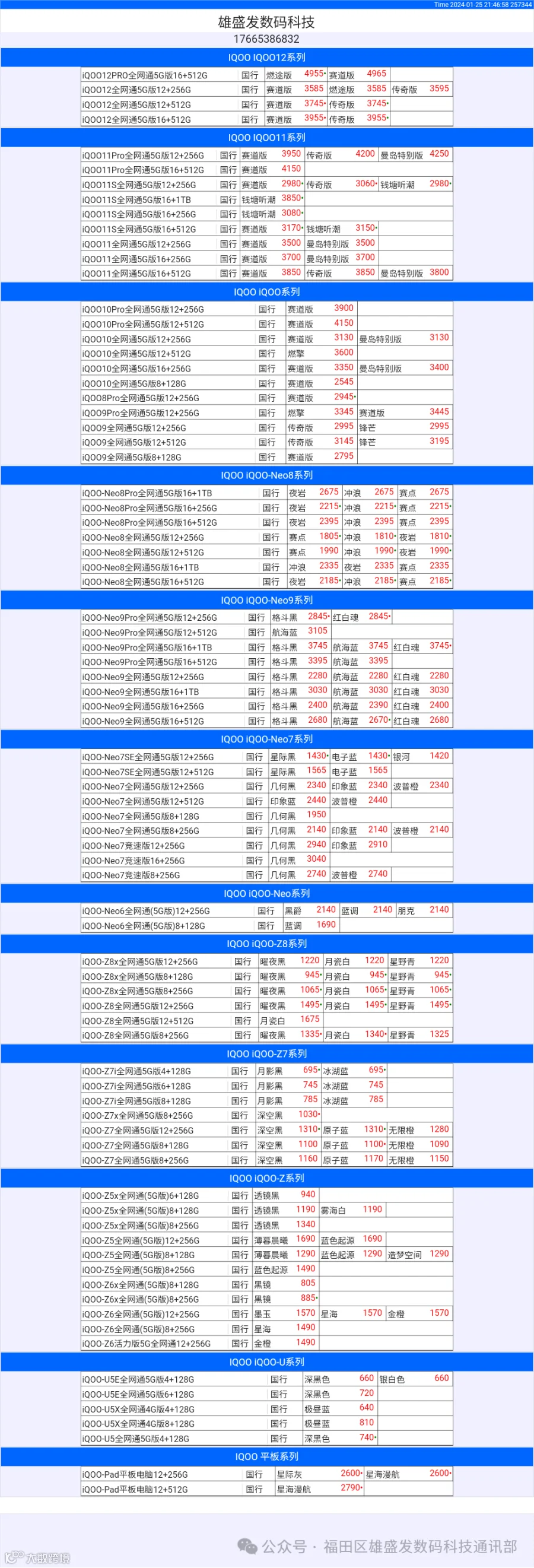 新机报价【2024年1月25日】OPPO   VIVO  IQOO   一加   真我 芯烨微 电子科技