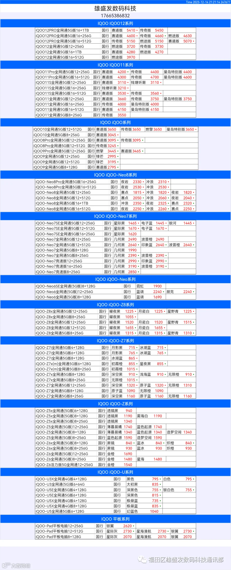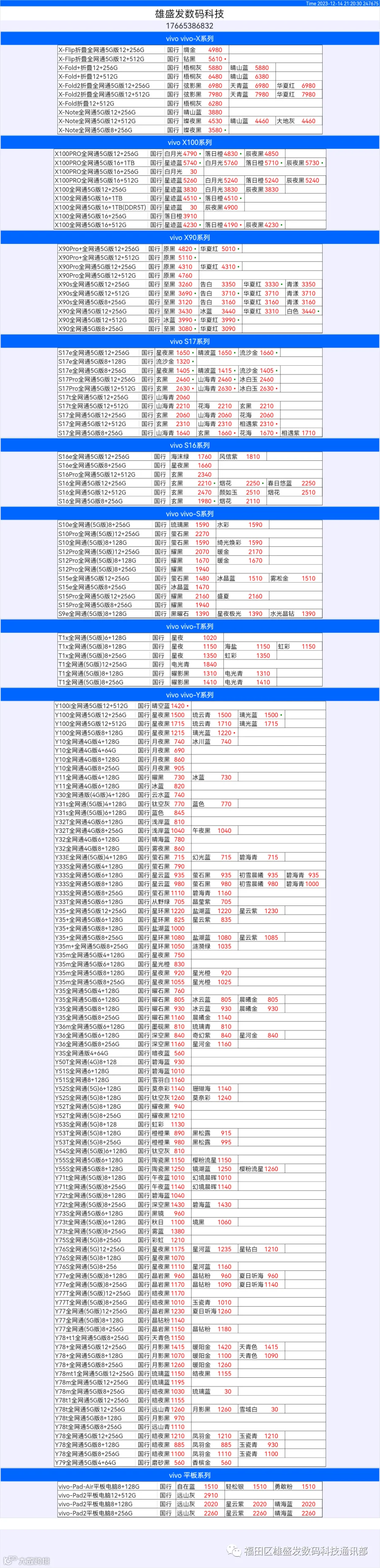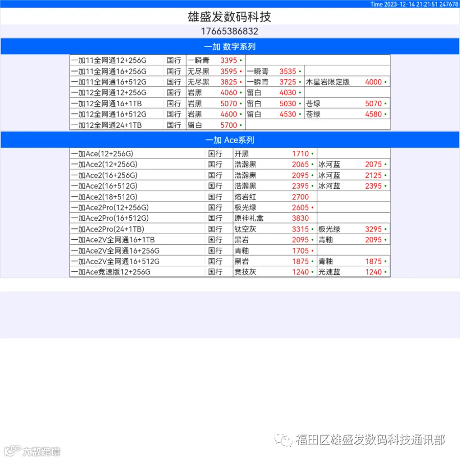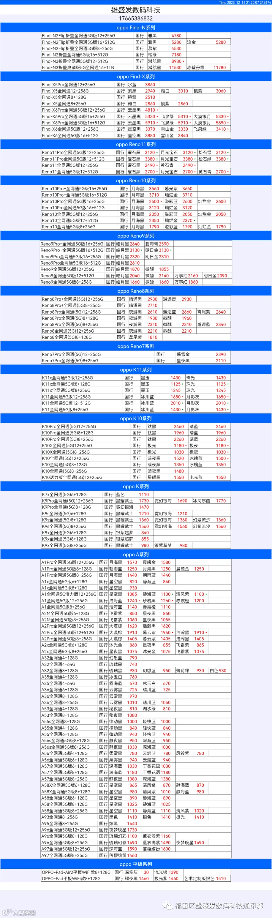新机报价【2023年12月14日】OPPO   VIVO  IQOO   一加   真我 芯烨微 电子科技