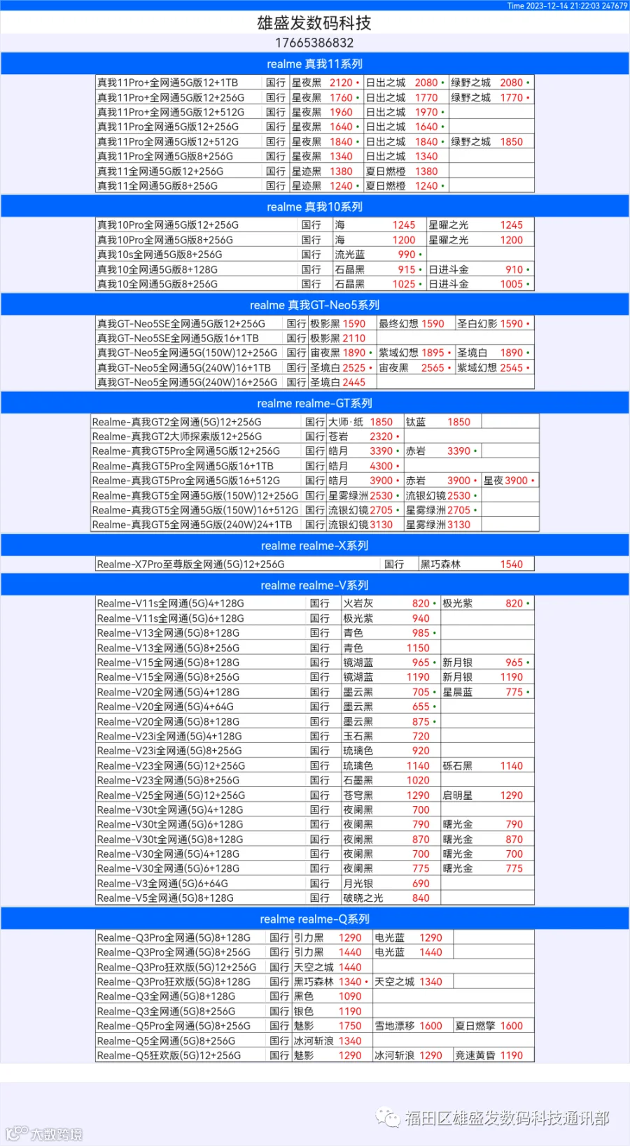 新机报价【2023年12月14日】OPPO VIVO IQOO 一加 真我