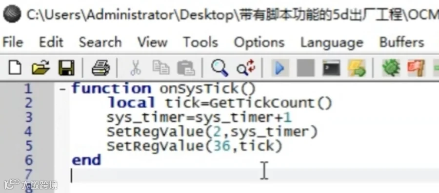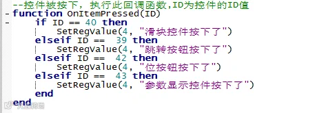 找到上方靠右边的LUA按钮,点击按钮,进入脚本编写的界面,现在编写控件按下通知显示的例程程序,详细的代码如图所示。