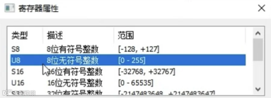 设置寄存器,进入配置寄存器页面,添加寄存器,选择u8类型寄存器,设置最大值为100。