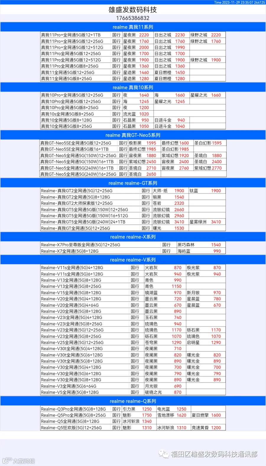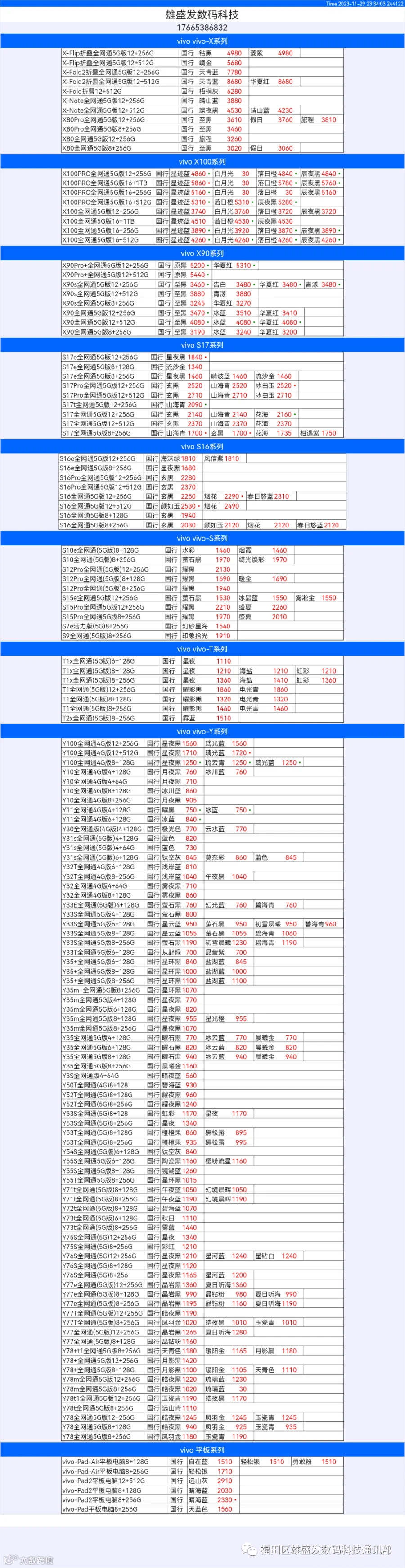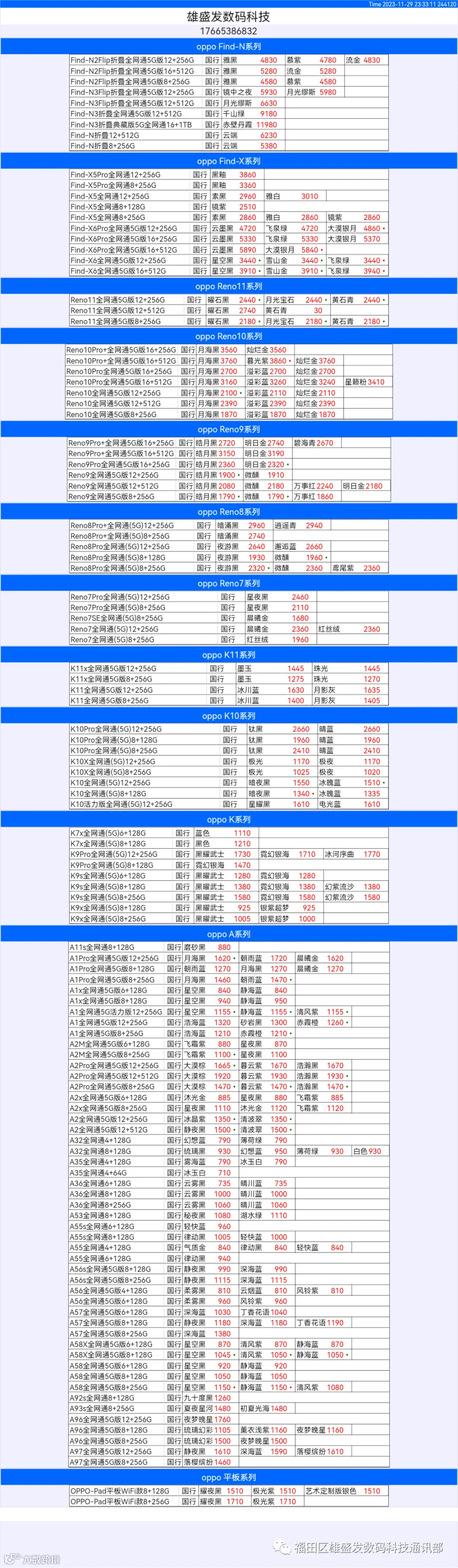 新机报价【2023年11月29日】OPPO   VIVO  IQOO   一加   真我 芯烨微 电子科技