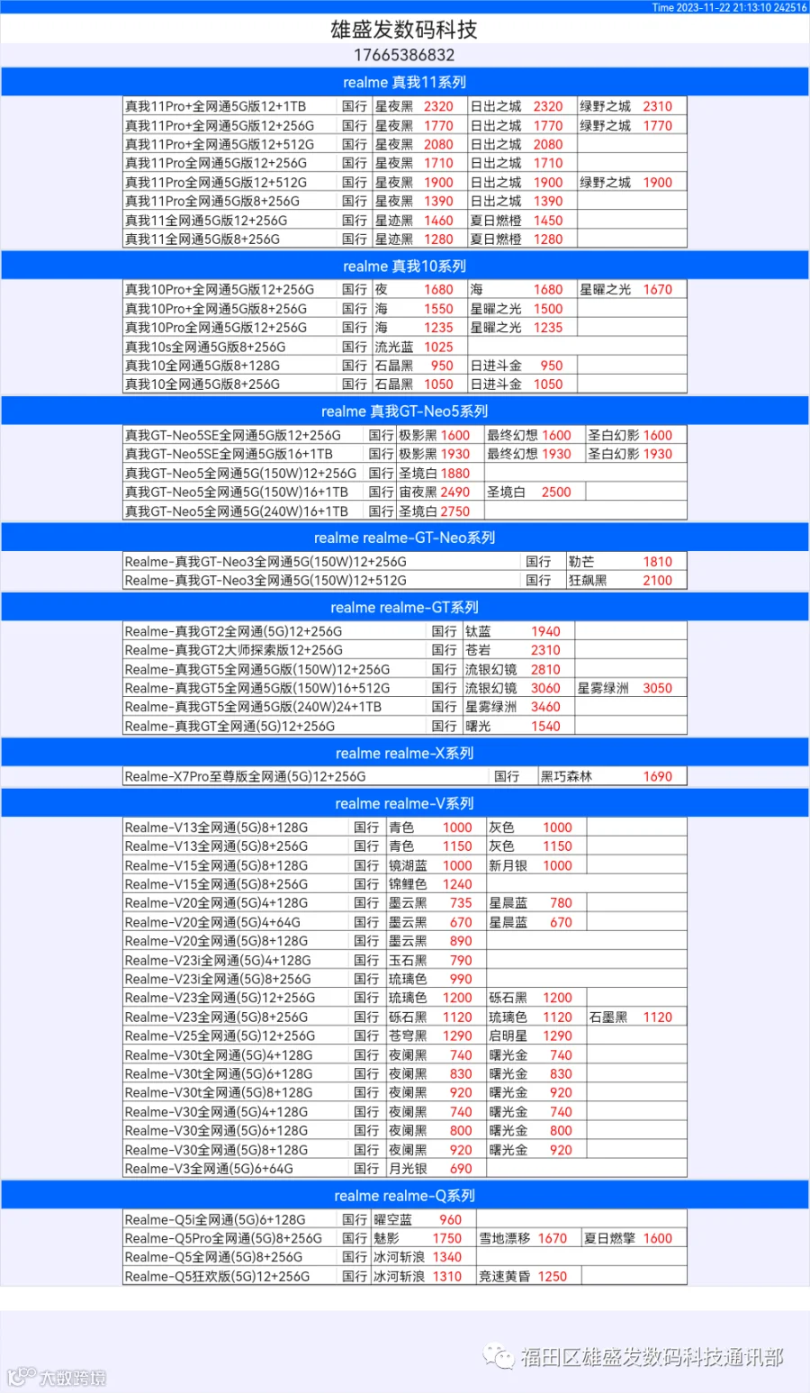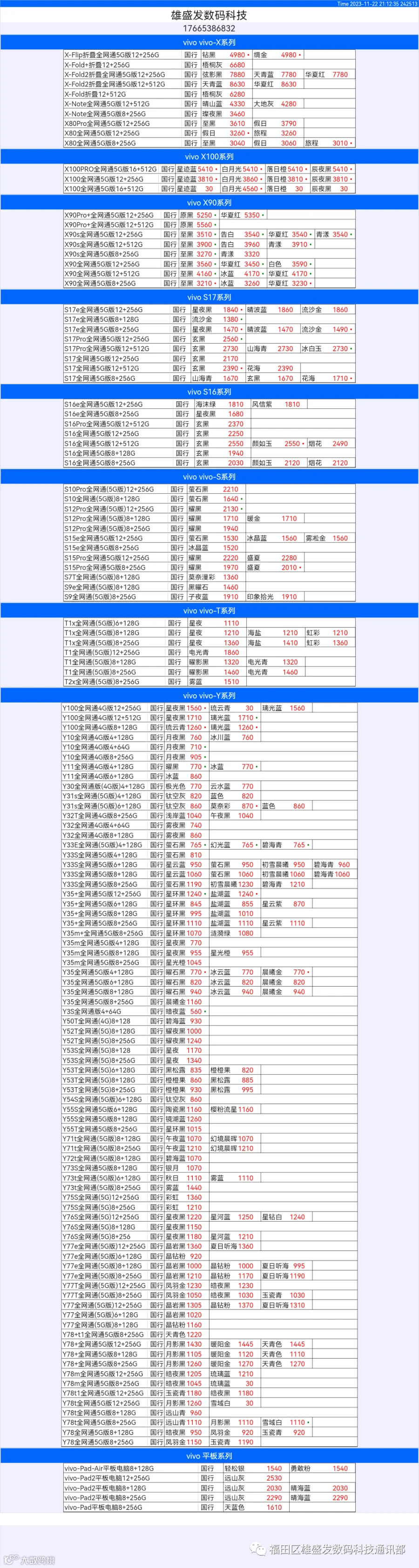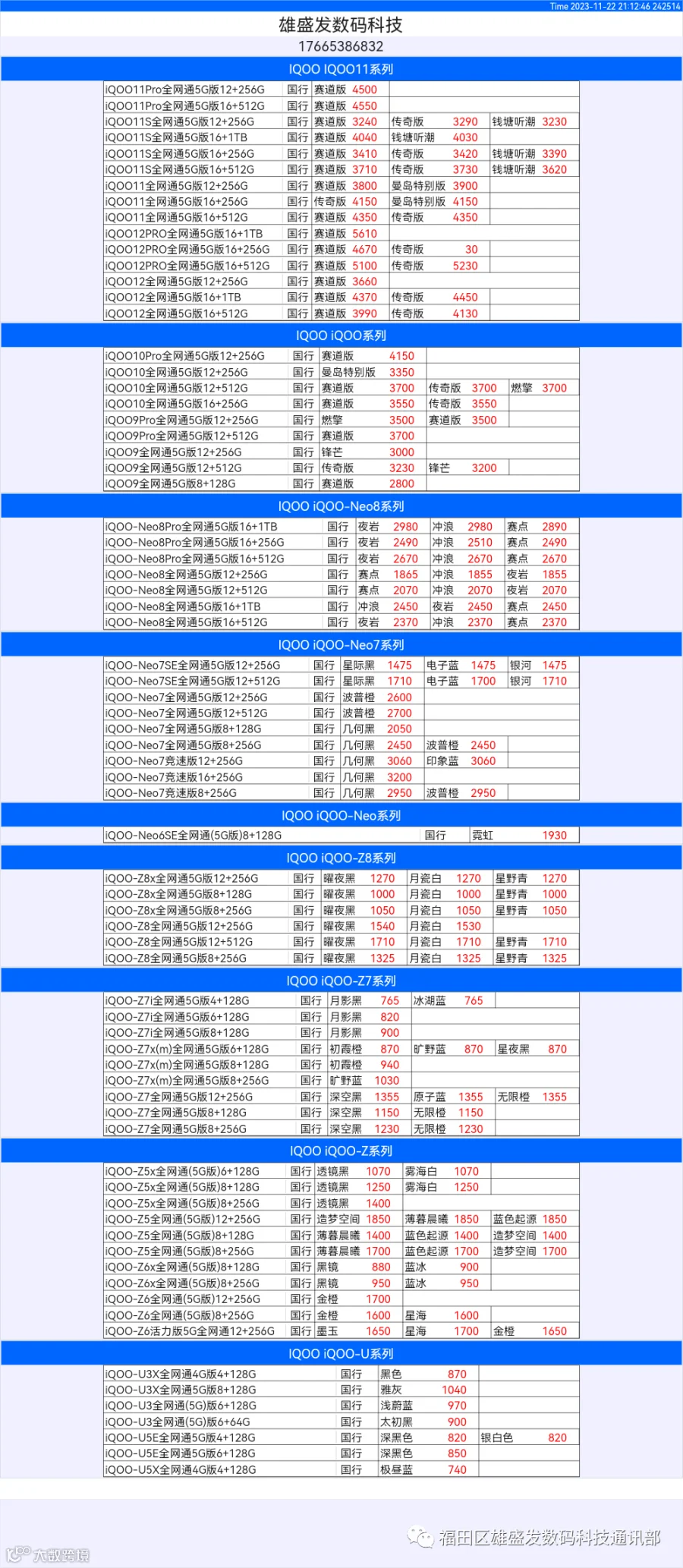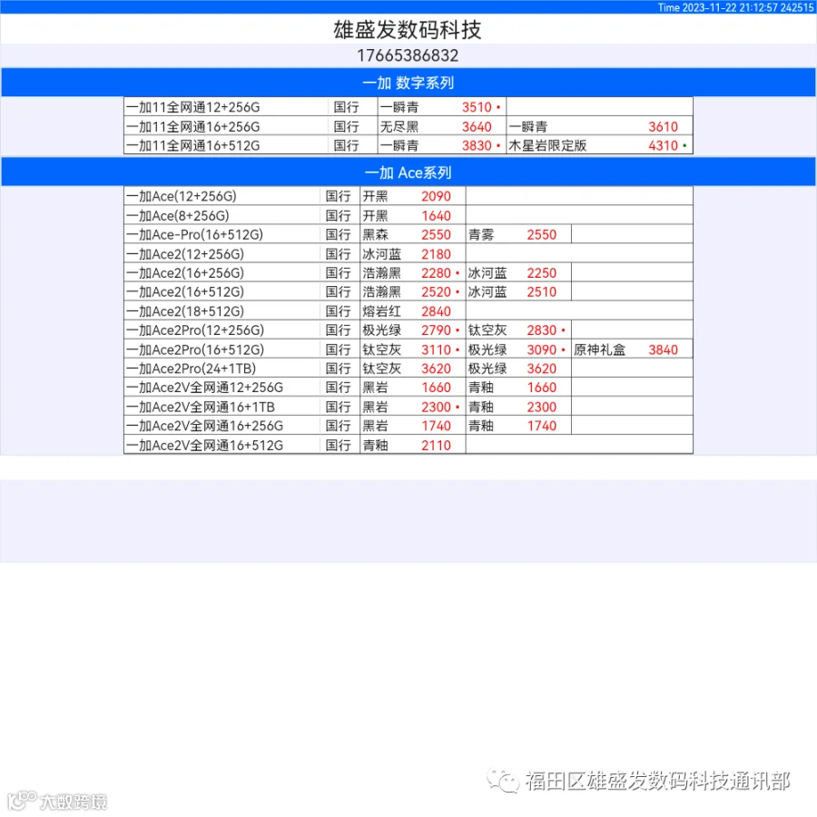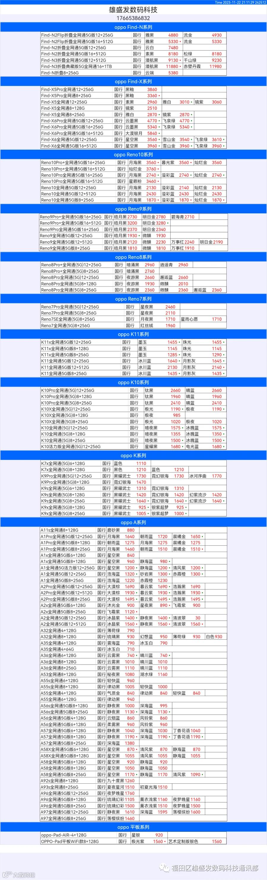 新机报价【2023年11月22日】OPPO   VIVO  IQOO   一加   真我 芯烨微 电子科技