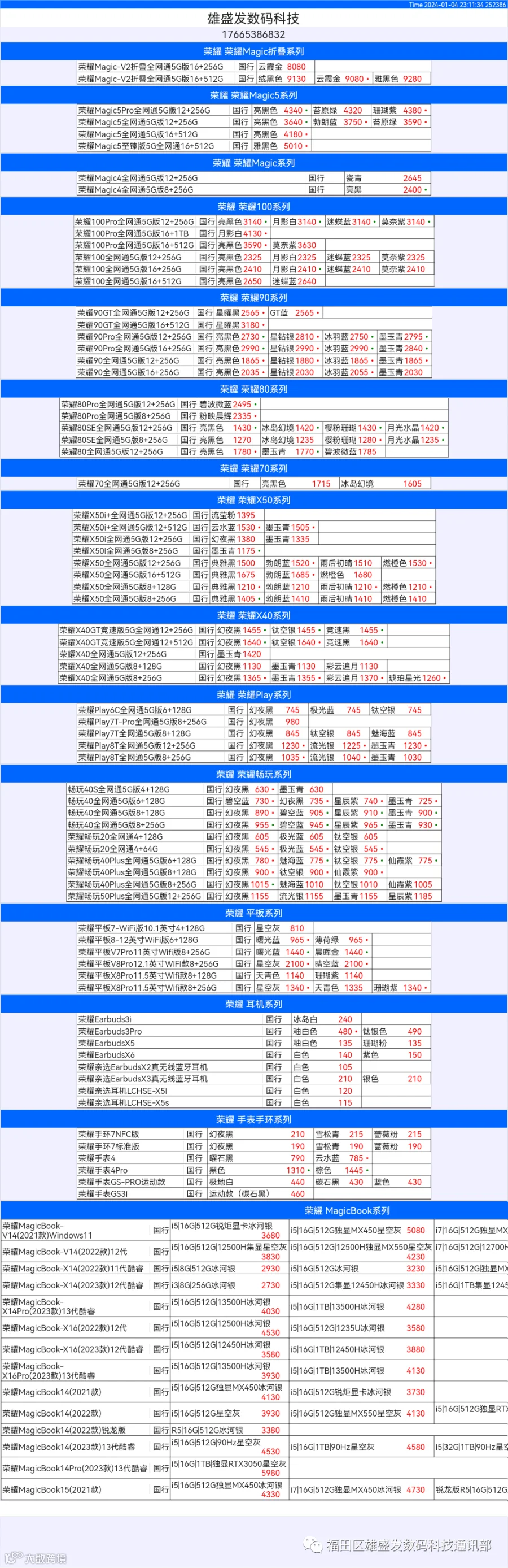 新机报价【2024年1月4日】华为 荣耀 报价
