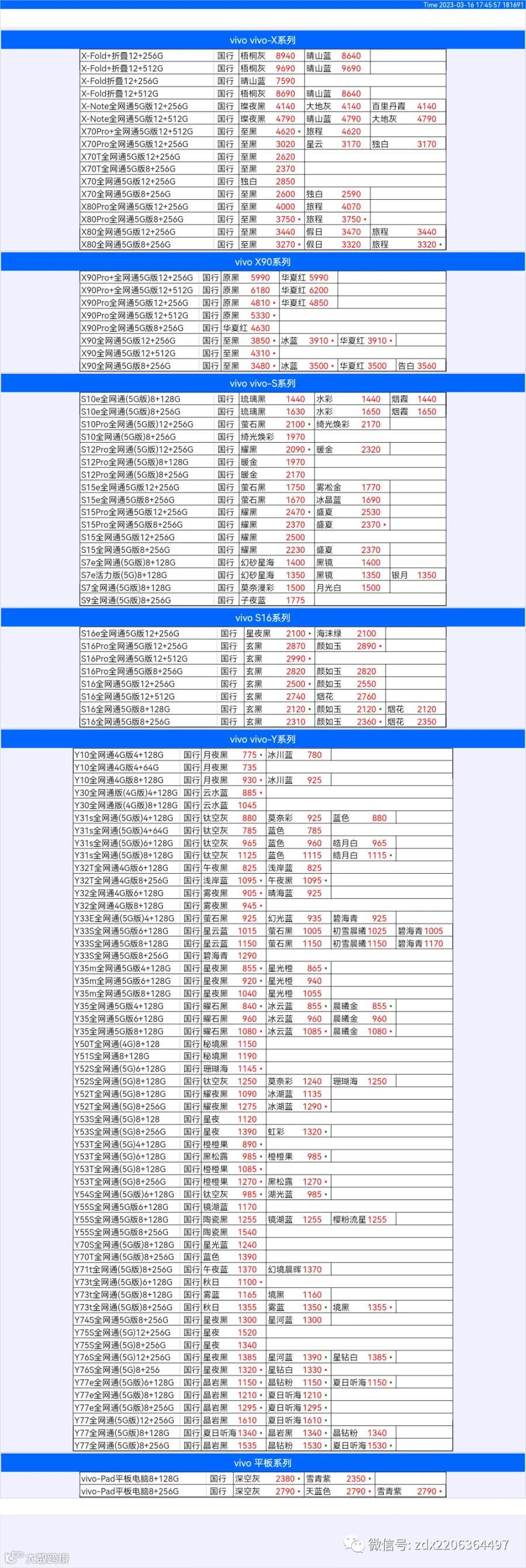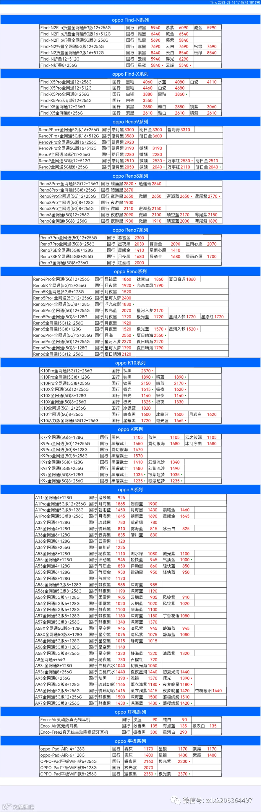 新机报价【2023年3月16日】OPPO   VIVO  IQOO   一加   真我 芯烨微 电子科技