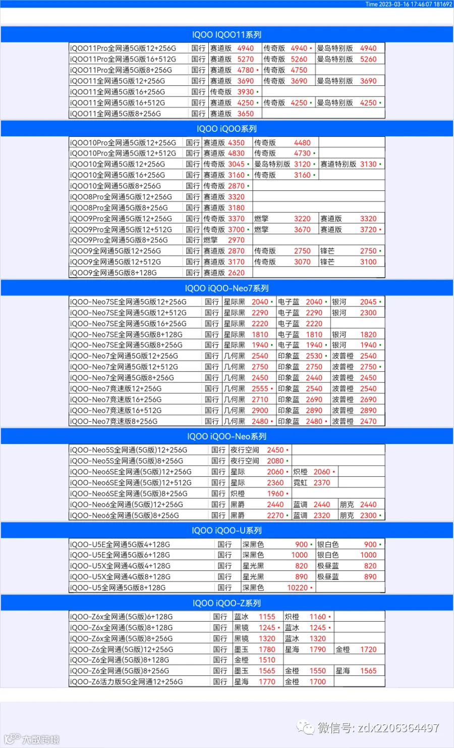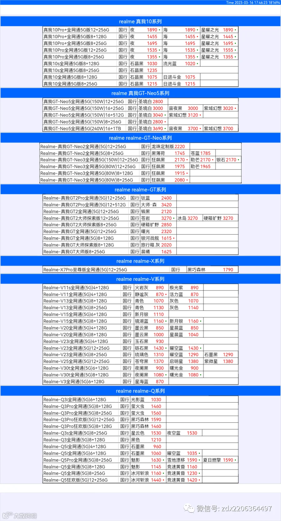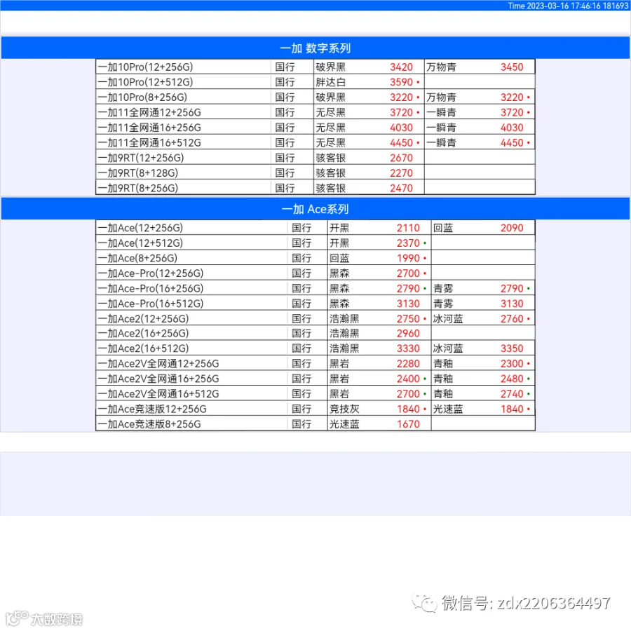 新机报价【2023年3月16日】OPPO VIVO IQOO 一加 真我