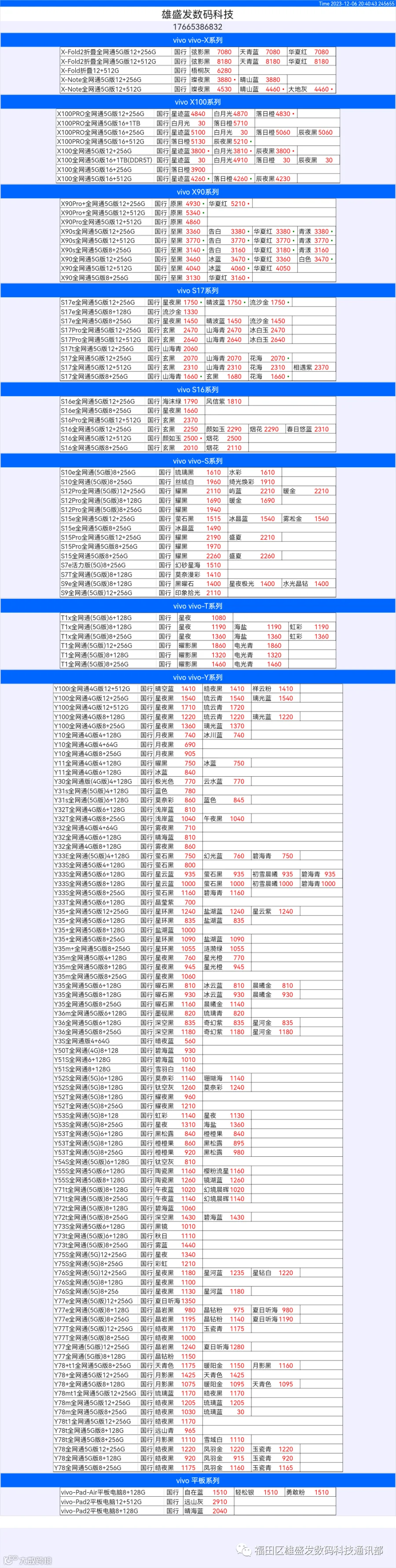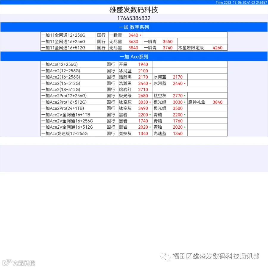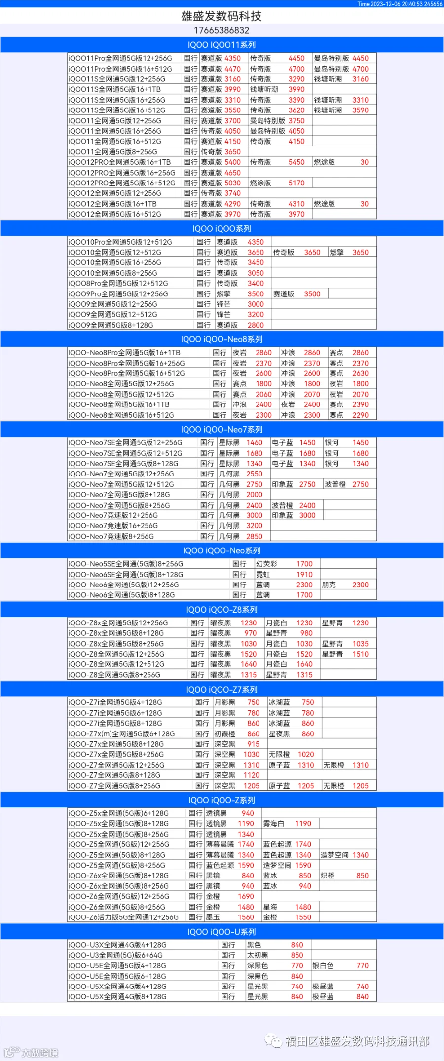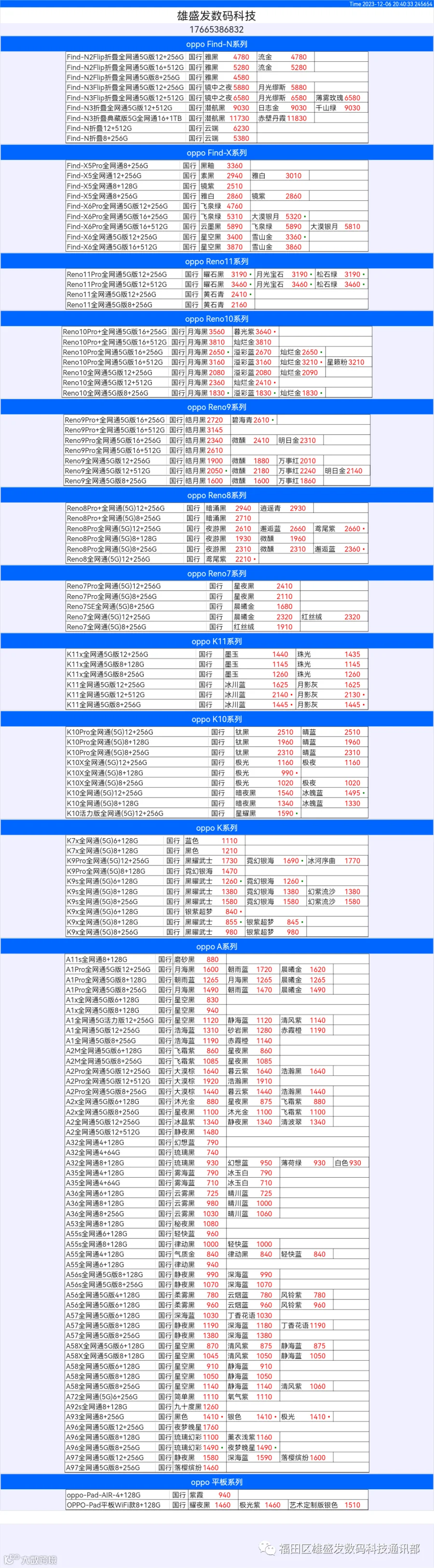 新机报价【2023年12月6日】OPPO   VIVO  IQOO   一加   真我 芯烨微 电子科技