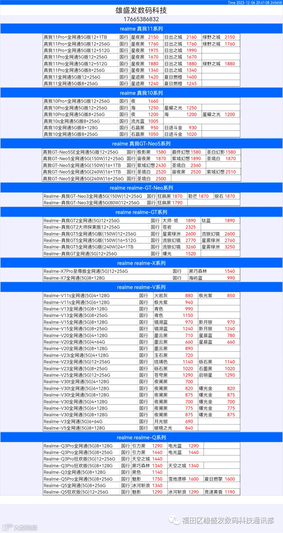 新机报价【2023年12月6日】OPPO VIVO IQOO 一加 真我