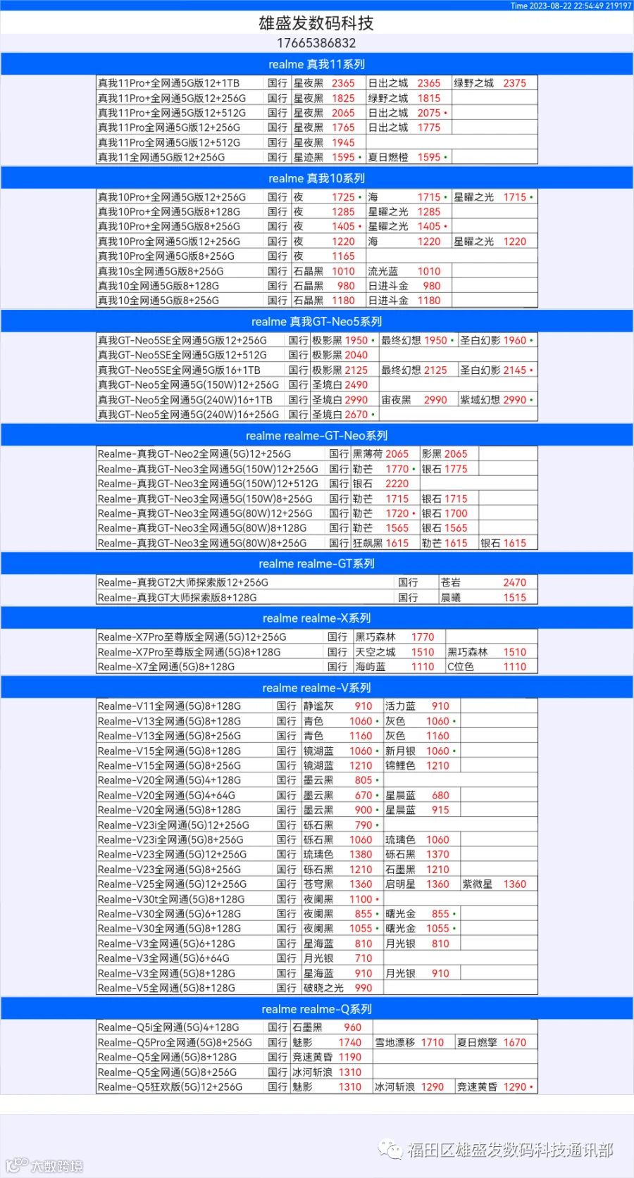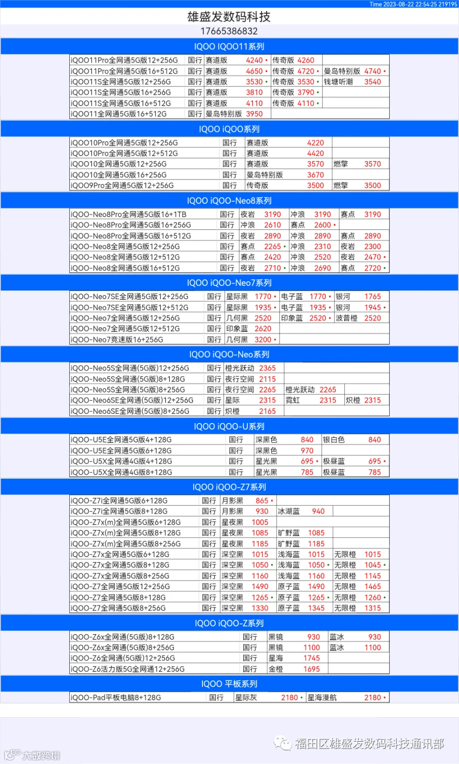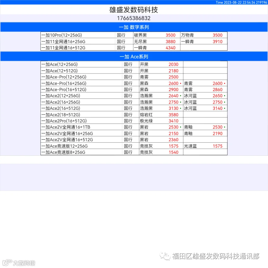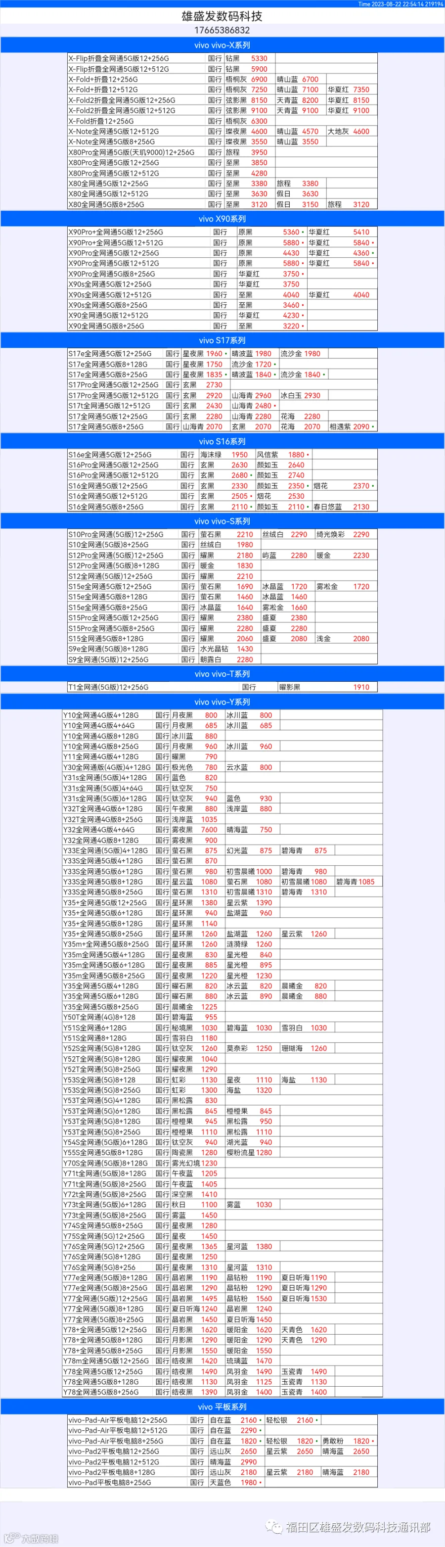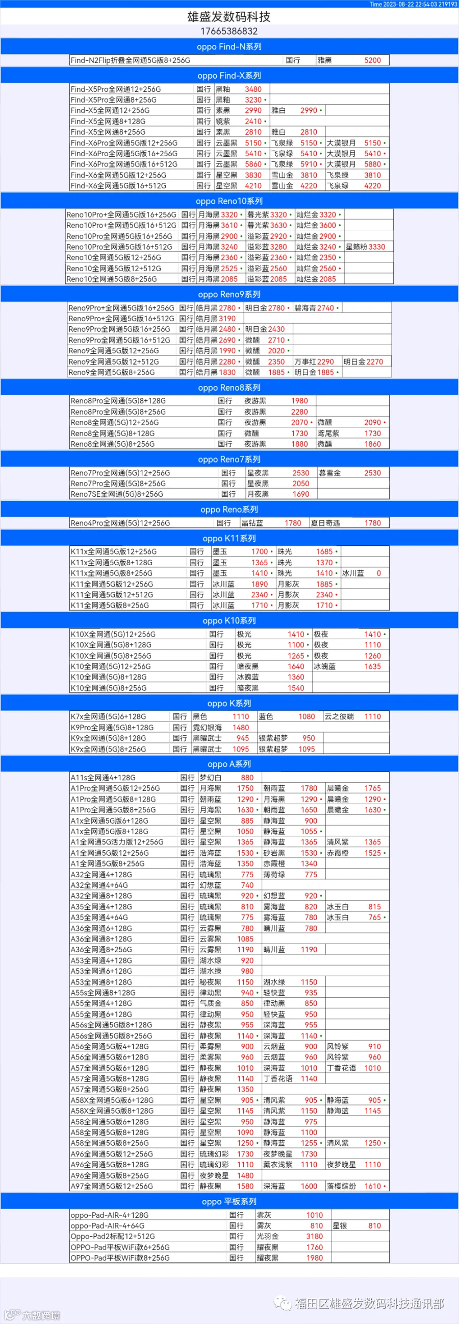 新机报价【2023年8月22日】OPPO   VIVO  IQOO   一加   真我 芯烨微 电子科技
