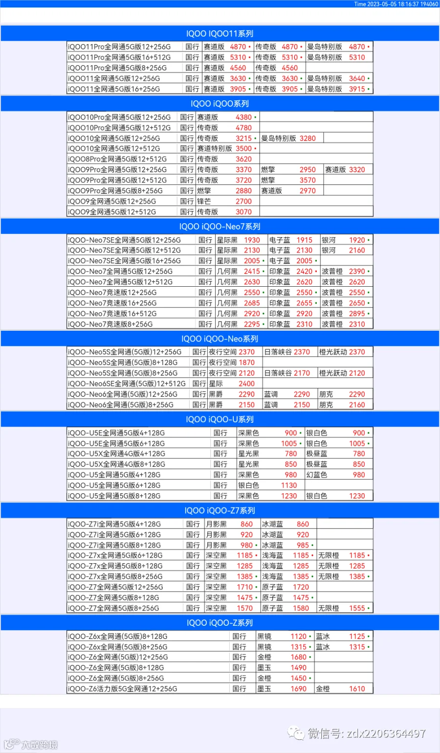 新机报价【2023年5月5日】OPPO VIVO IQOO 一加 真我
