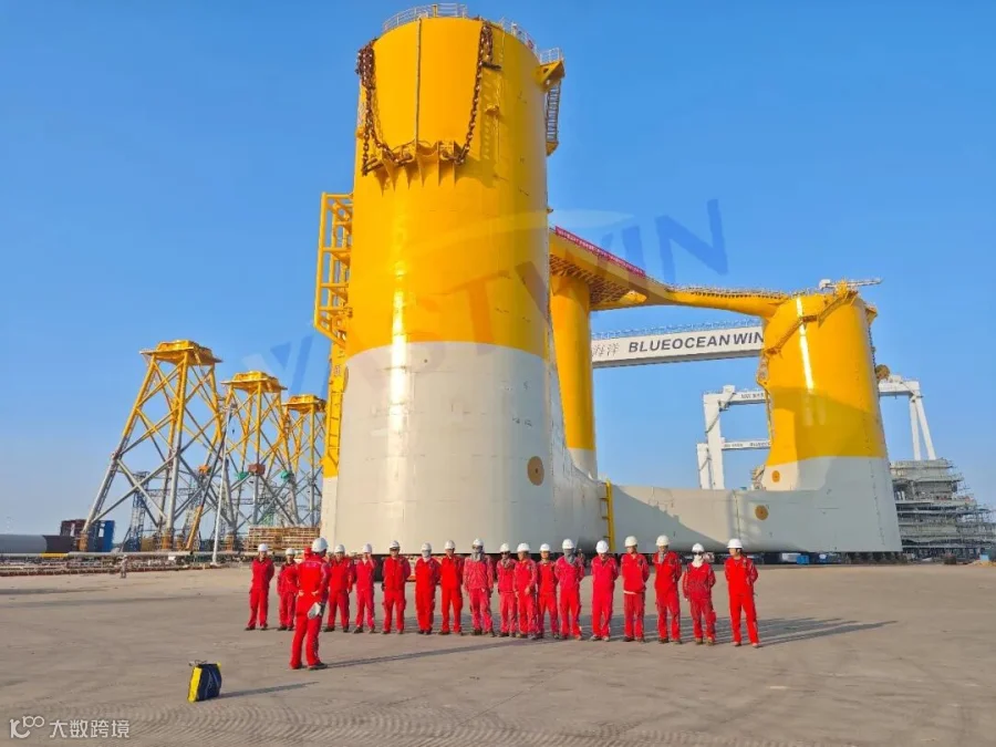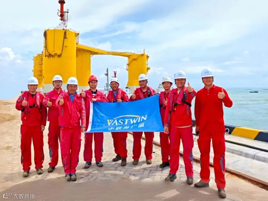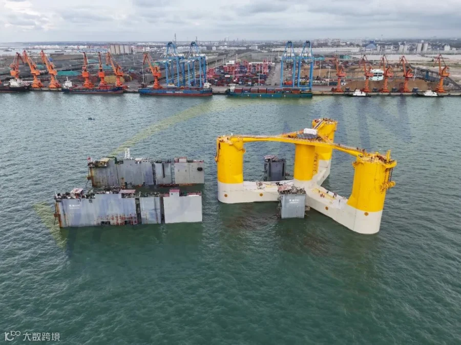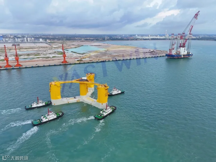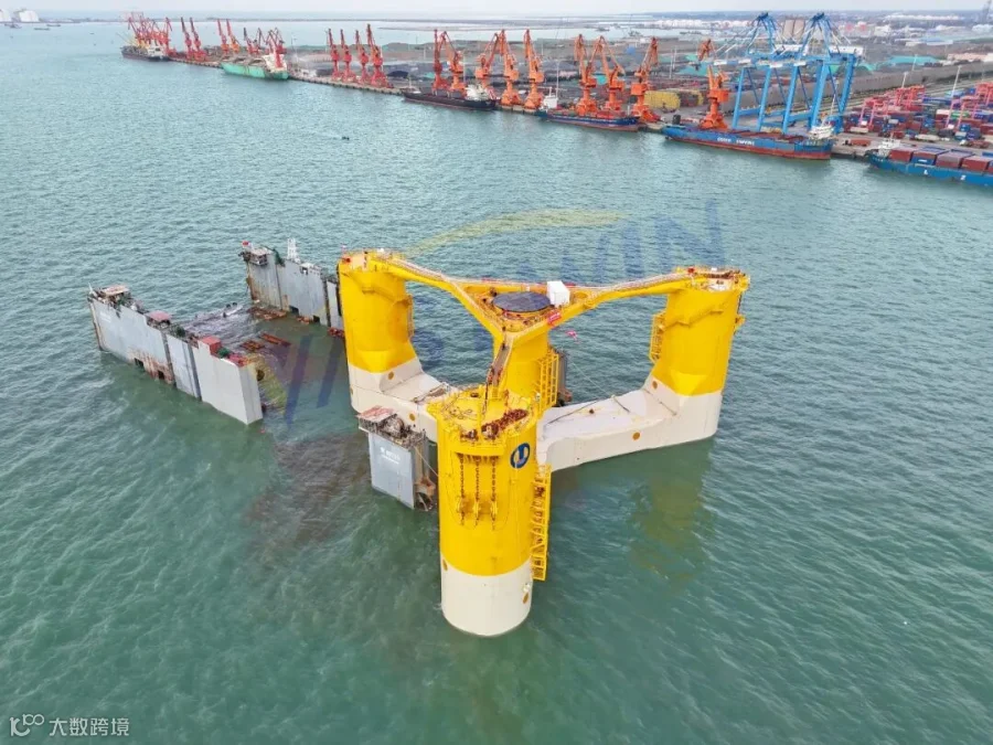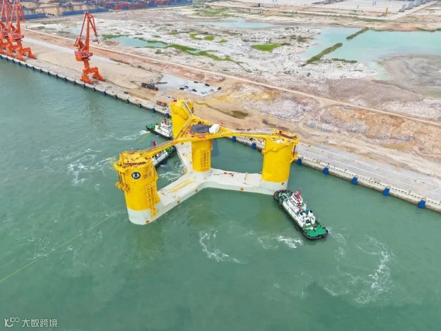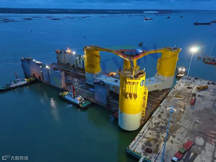最终,平台安全抵达预定海域完成下潜作业,再经港作拖轮拖带至码头泊位系泊,为后续塔筒、风机等关键部件组装做准备。