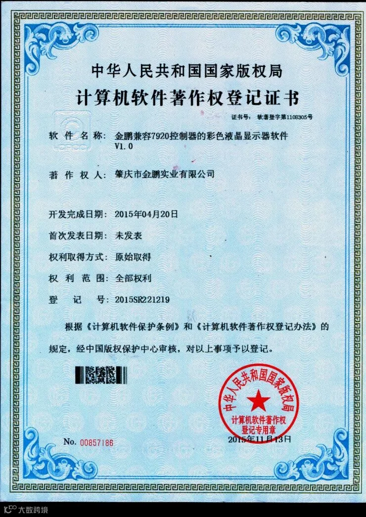 由于在坚持创新和严守品质上的持续发力,让我们金鹏实业收获了一系列的殊荣:先后获得了“国家高新技术企业”、“肇庆市新型液晶模块显示技术(金鹏)工程技术研究中心”等多项荣誉;与此同时,还拥有多项发明专利、实用新型专利和计算机软件著作权等知识产权。产品严格按照ISO9001:2015国际质量体系要求生产,多项产品符合RoHS2.0、电磁兼容(EMC)等指令要求。