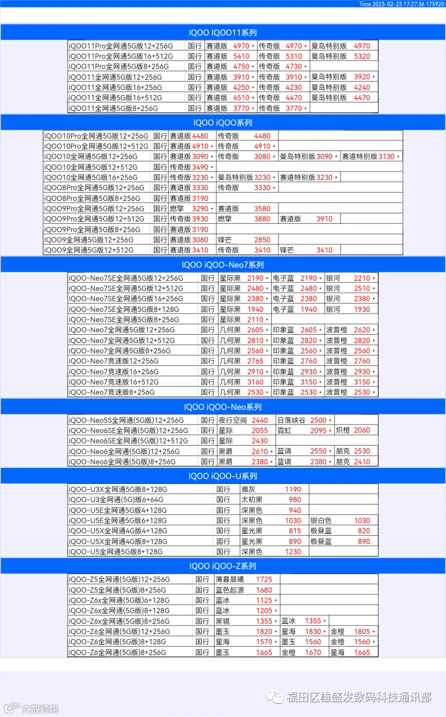 新机报价【2023年2月23日】OPPO VIVO IQOO 一加 真我