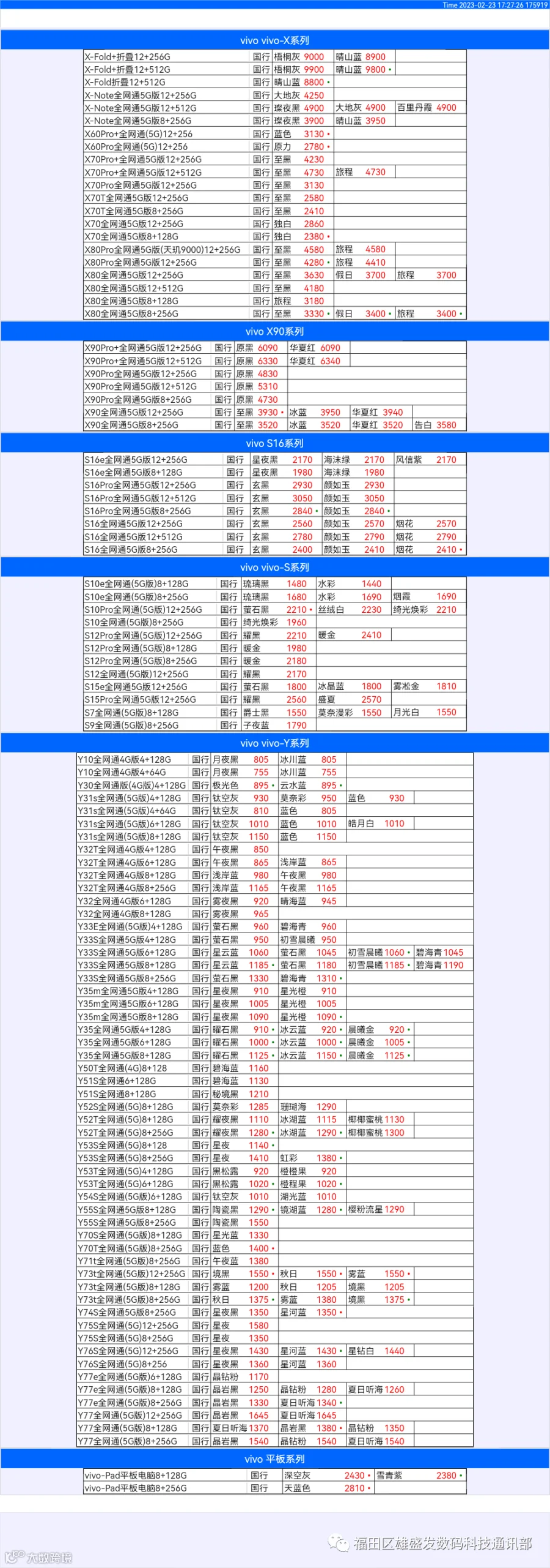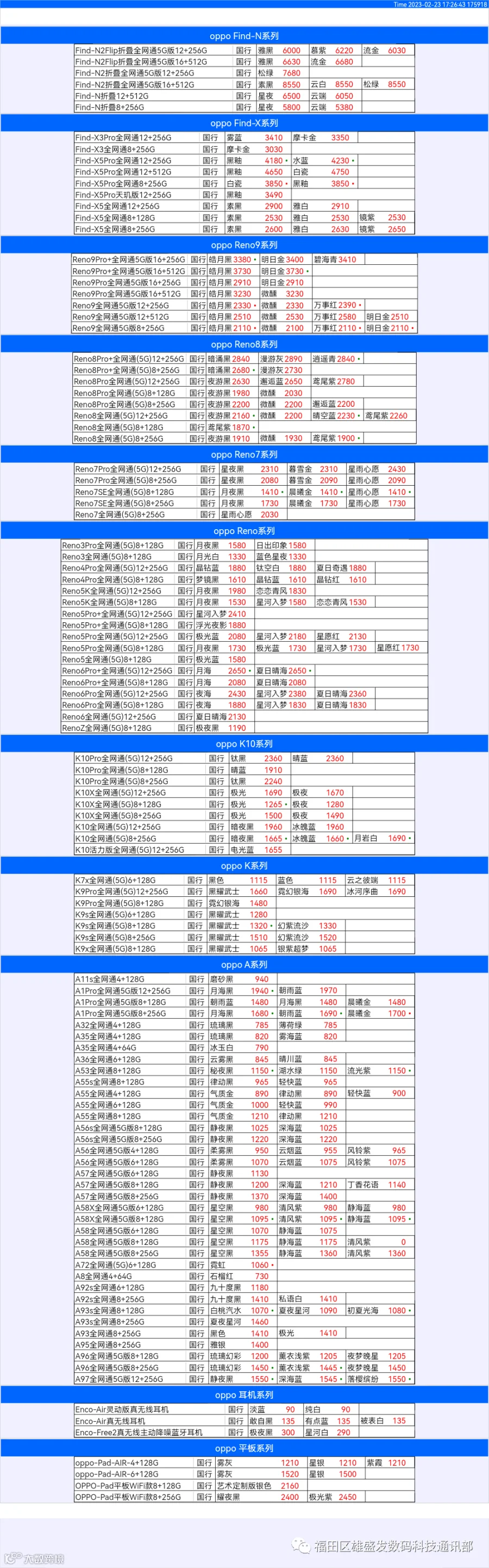 新机报价【2023年2月23日】OPPO   VIVO  IQOO   一加   真我 芯烨微 电子科技