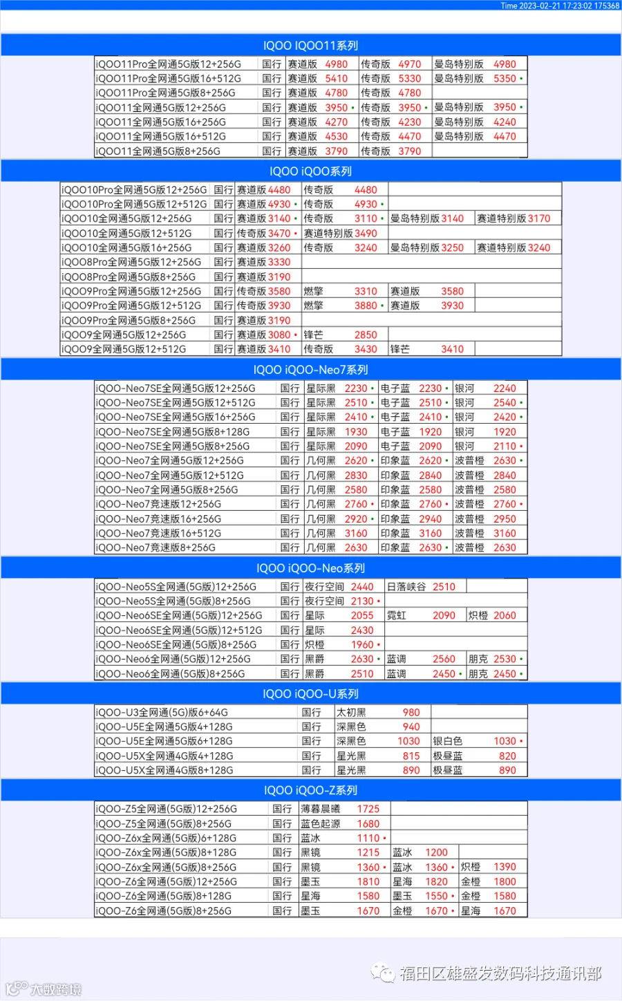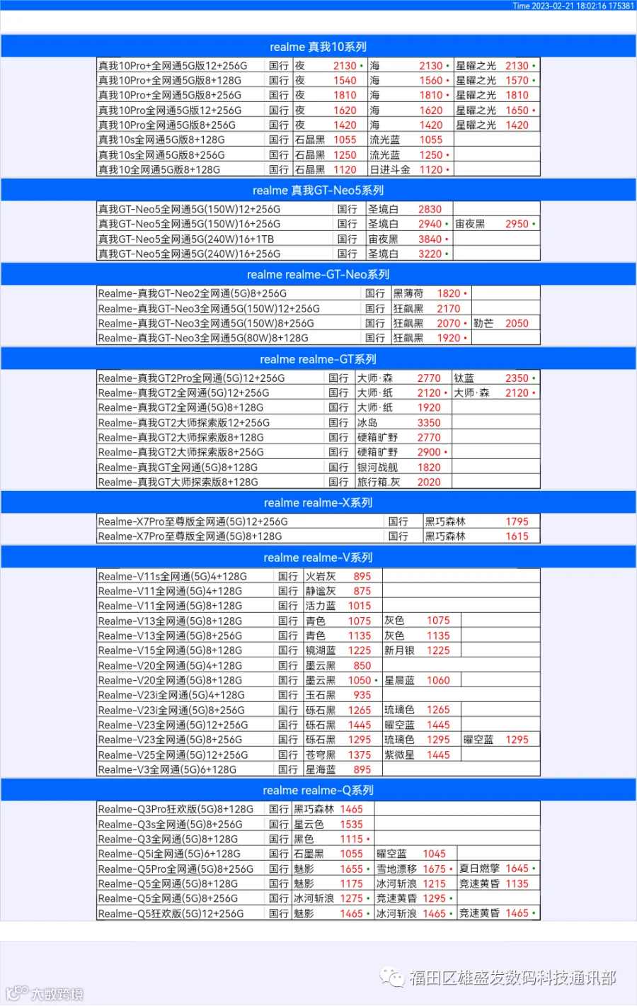 新机报价【2023年2月21日】OPPO VIVO IQOO 一加 真我