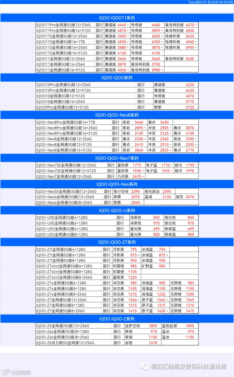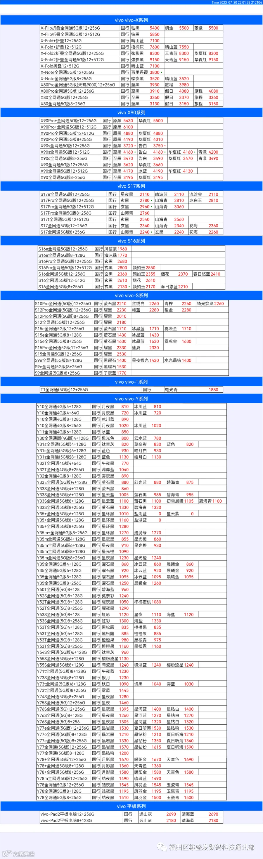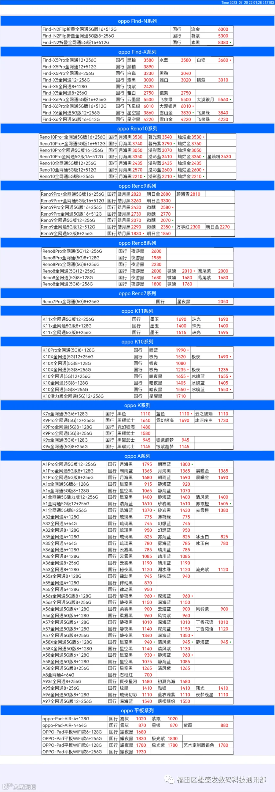 新机报价【2023年7月20日】OPPO   VIVO  IQOO   一加   真我 芯烨微 电子科技
