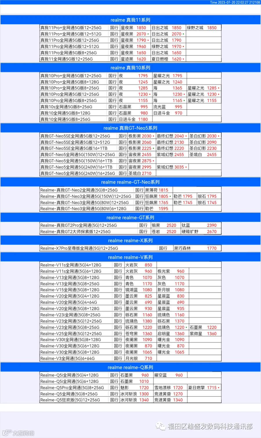 新机报价【2023年7月20日】OPPO VIVO IQOO 一加 真我