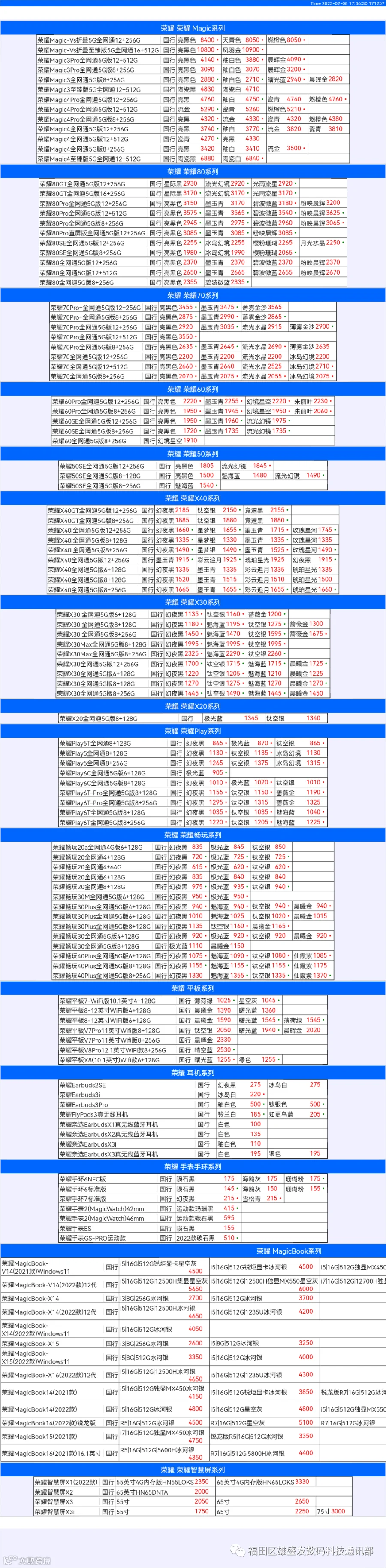 新机报价【2023年2月8日】华为 荣耀 报价