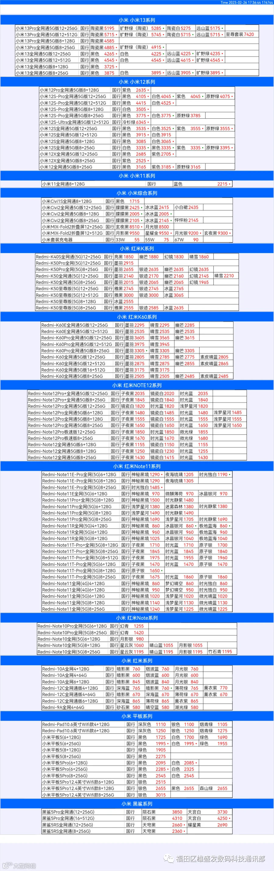 新机报价【2023年2月26日】小米  红米   黑鲨   报价 芯烨微 电子科技