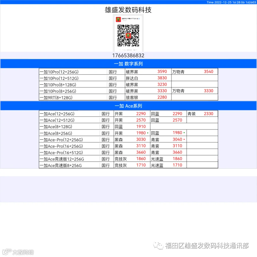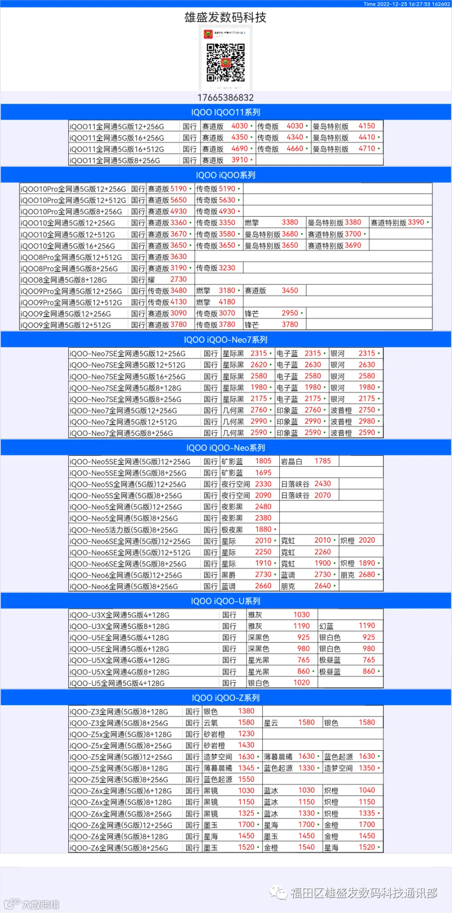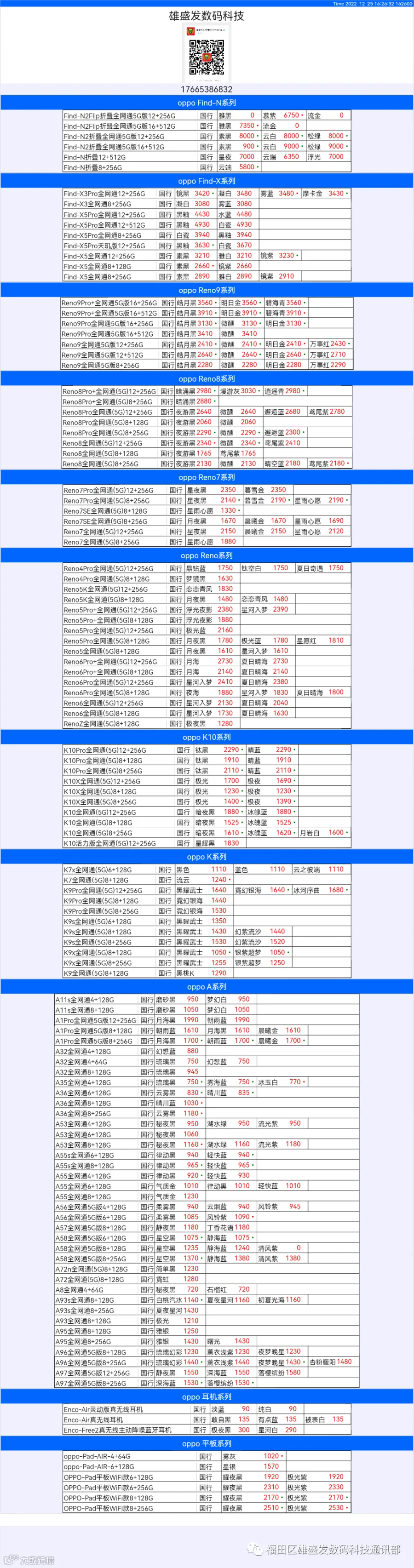新机报价【2022年12月25日】OPPO   VIVO  IQOO   一加   真我 芯烨微 电子科技